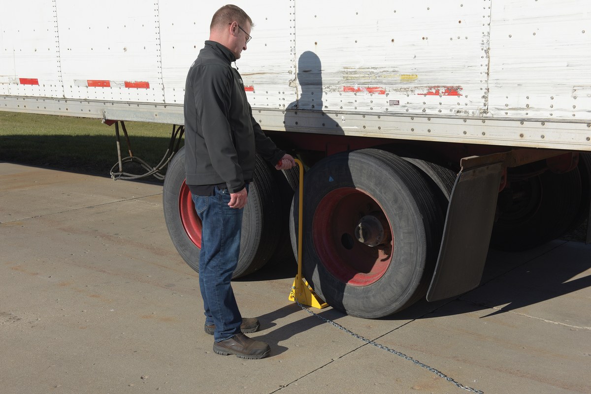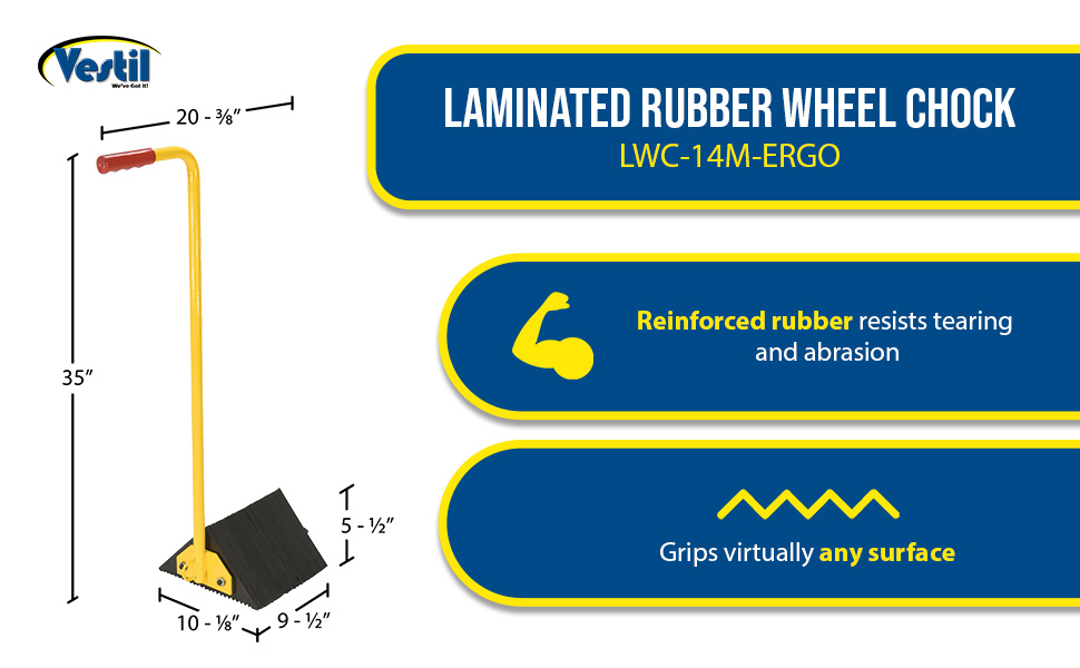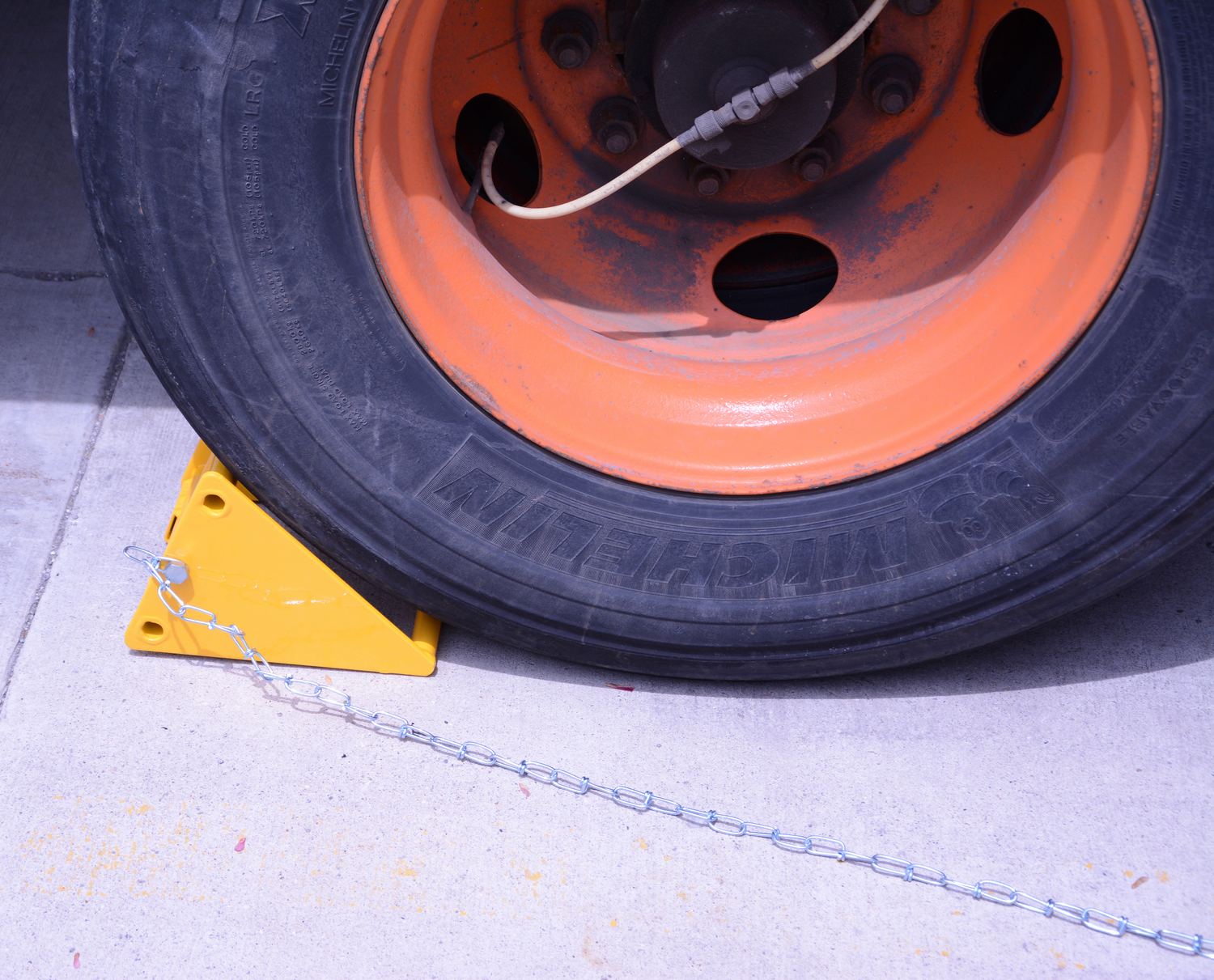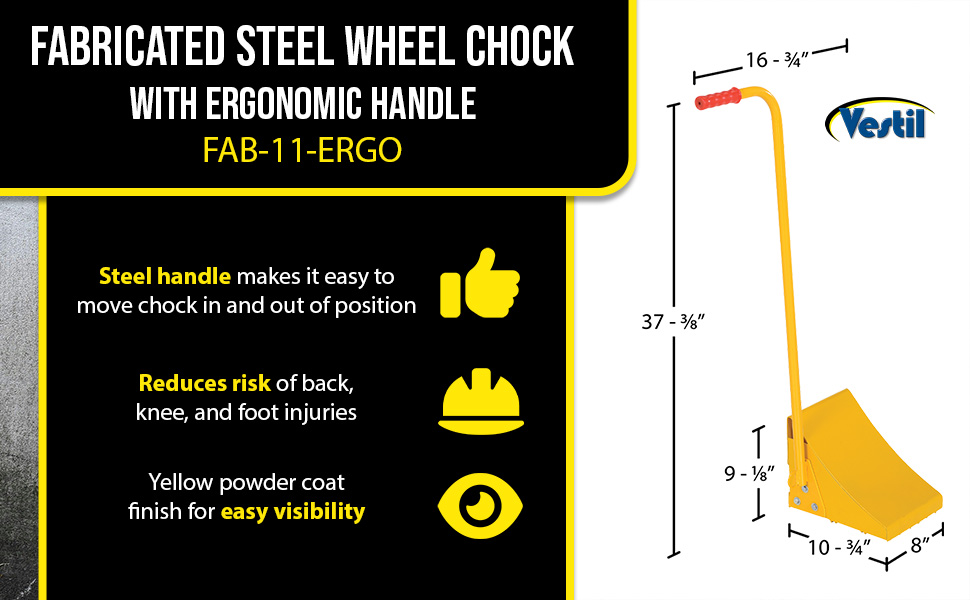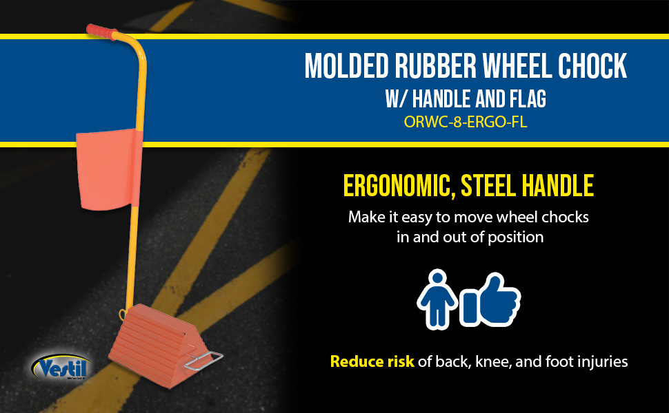 Ergonomically designed to make it easy to move wheel chocks in and out of position under trailer wheels. Reduce the risk of back, knee, and foot injuries. Handle is constructed of steel and includes a yellow baked-in powder-coated toughness. D-Ring provided for attaching security chain (chain not included.) Assembly required. High Visibility Flag |