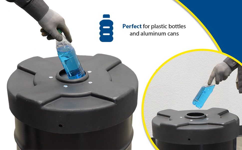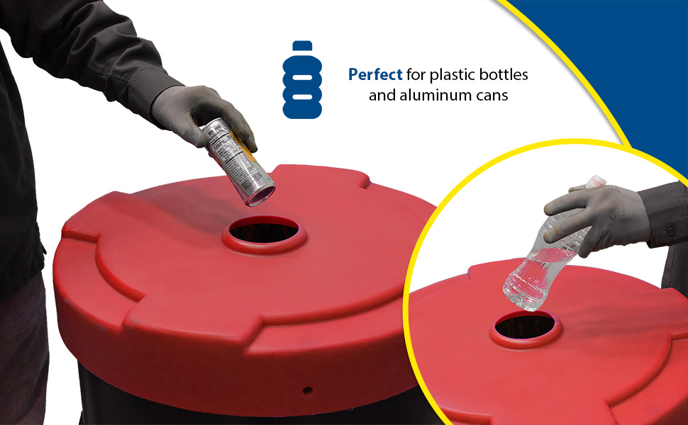 Collecting aluminum cans or plastic bottles could not be easier with Recycling Lids. Fits on open head plastic or steel drums only with lid and ring are removed. Low-density polyethylene construction. Fits snug to resist blowing off in outdoor environments or being tampered with by people or animals. CANF models have a flap to help discourage the removal of contents.