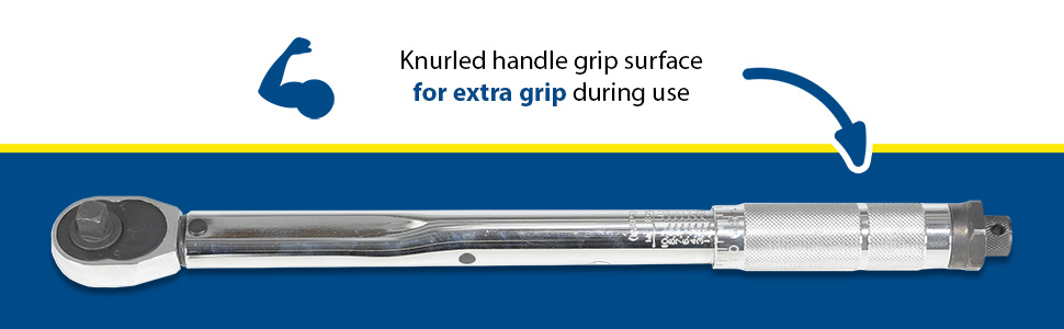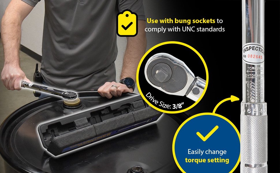 Reversible ratchet-head style torque wrench. Easy to set torque setting - wrench 'clicks' when setting is reached. Knurled handle grip surface for extra grip when using. Use with bung sockets to comply with UNC standards.