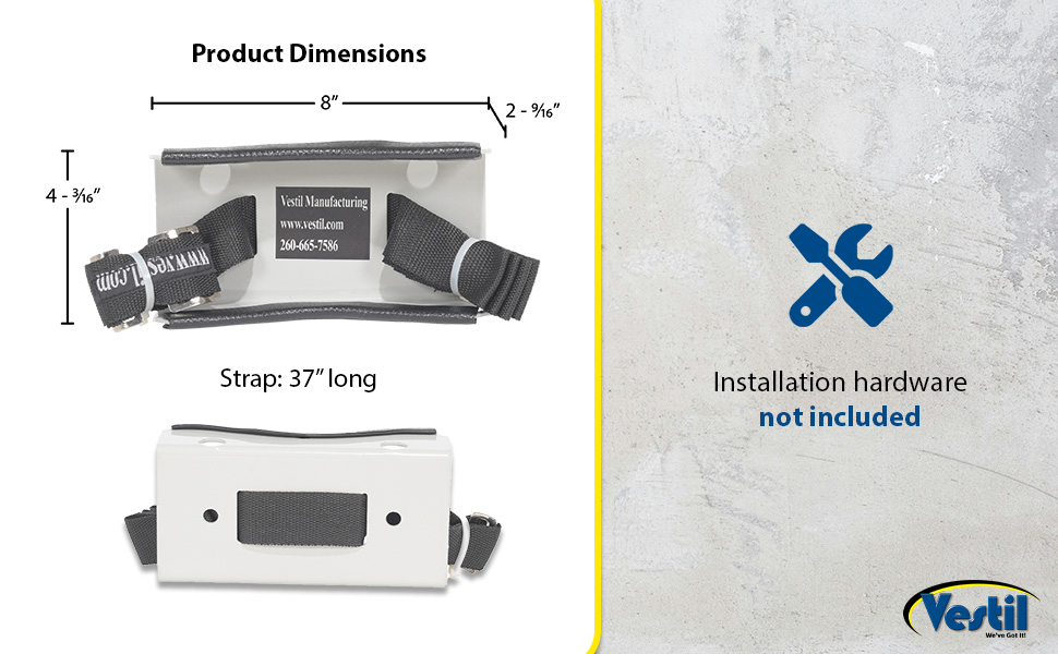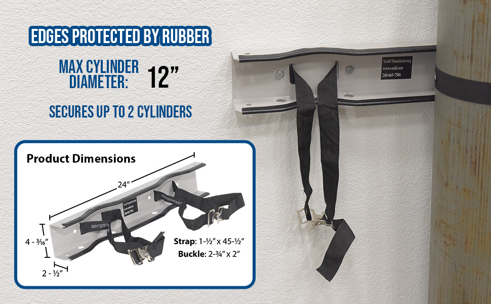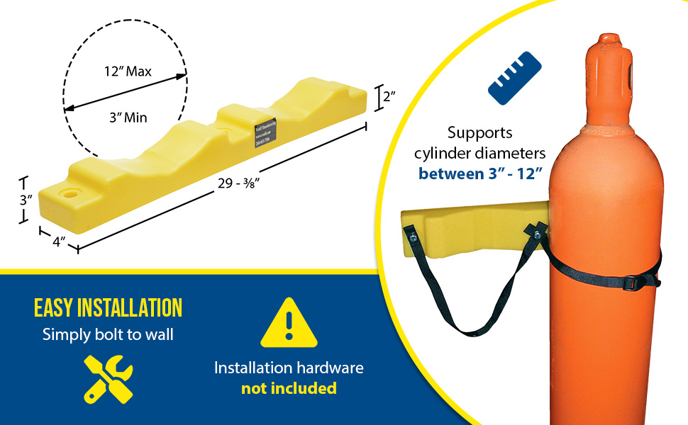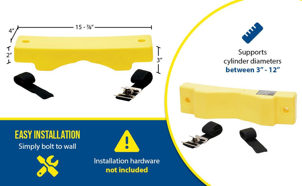 Simple design is easy to install. Simply bolt to wall and then secure cylinder with strap. Edges are protected with rubber guards on the steel units. Choose either steel or molded plastic construction. Maximum 12" cylinder diameter. For use in non-moving, static environments. Installation hardware is not included.