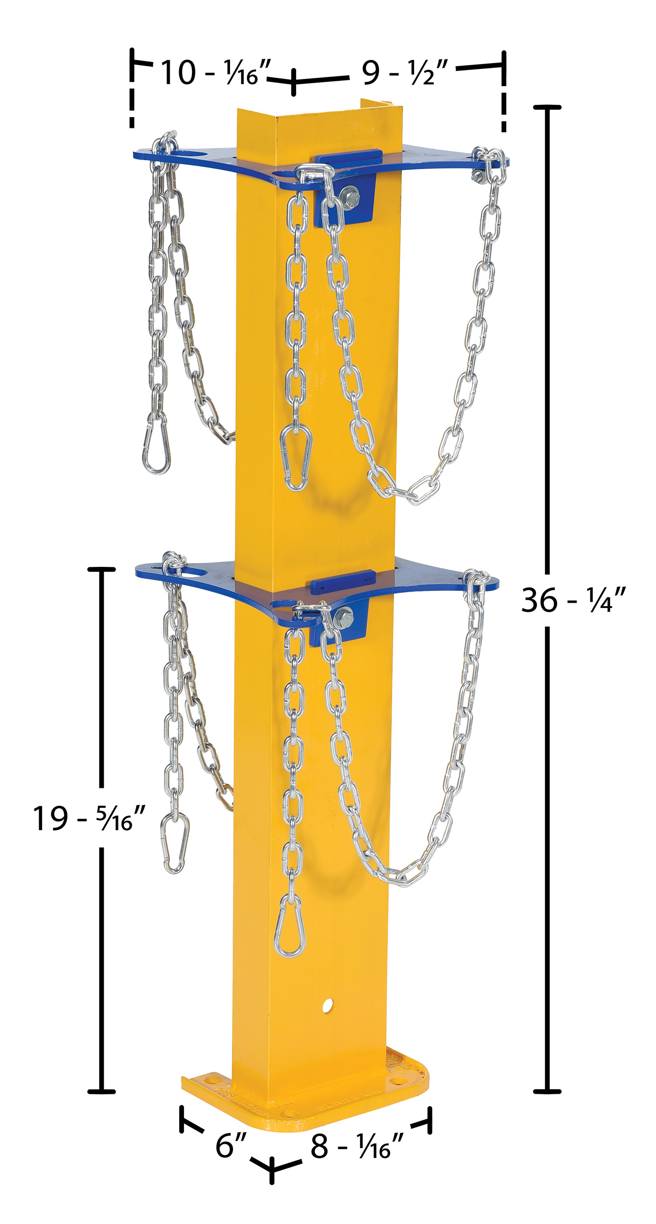A cylinder storage stand is great for additional cylinders that are both used and unused. The sturdy steel construction with a bright yellow and blue finish endorses visibility of the unit, both near and far. Two cylinders are able to be stood in a secure position due to the shaped steel and safety chain. The unit can be secured to the floor by utilizing the pre-drilled mounting holes at the base of the stand.