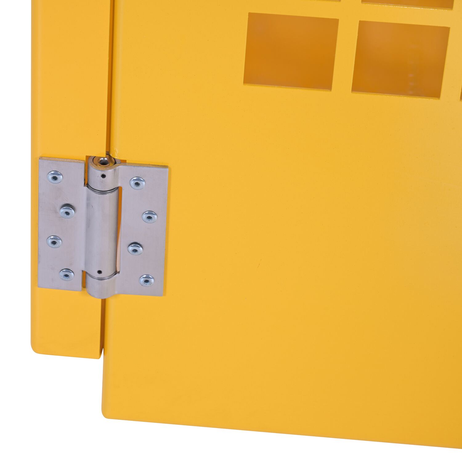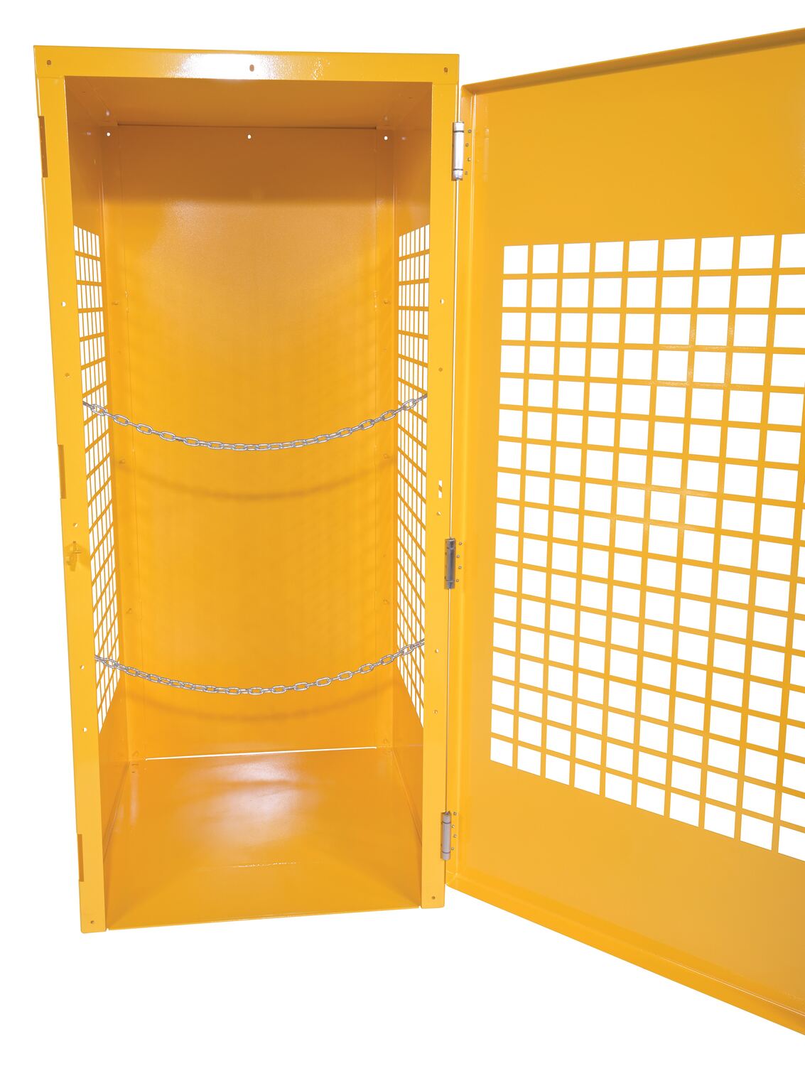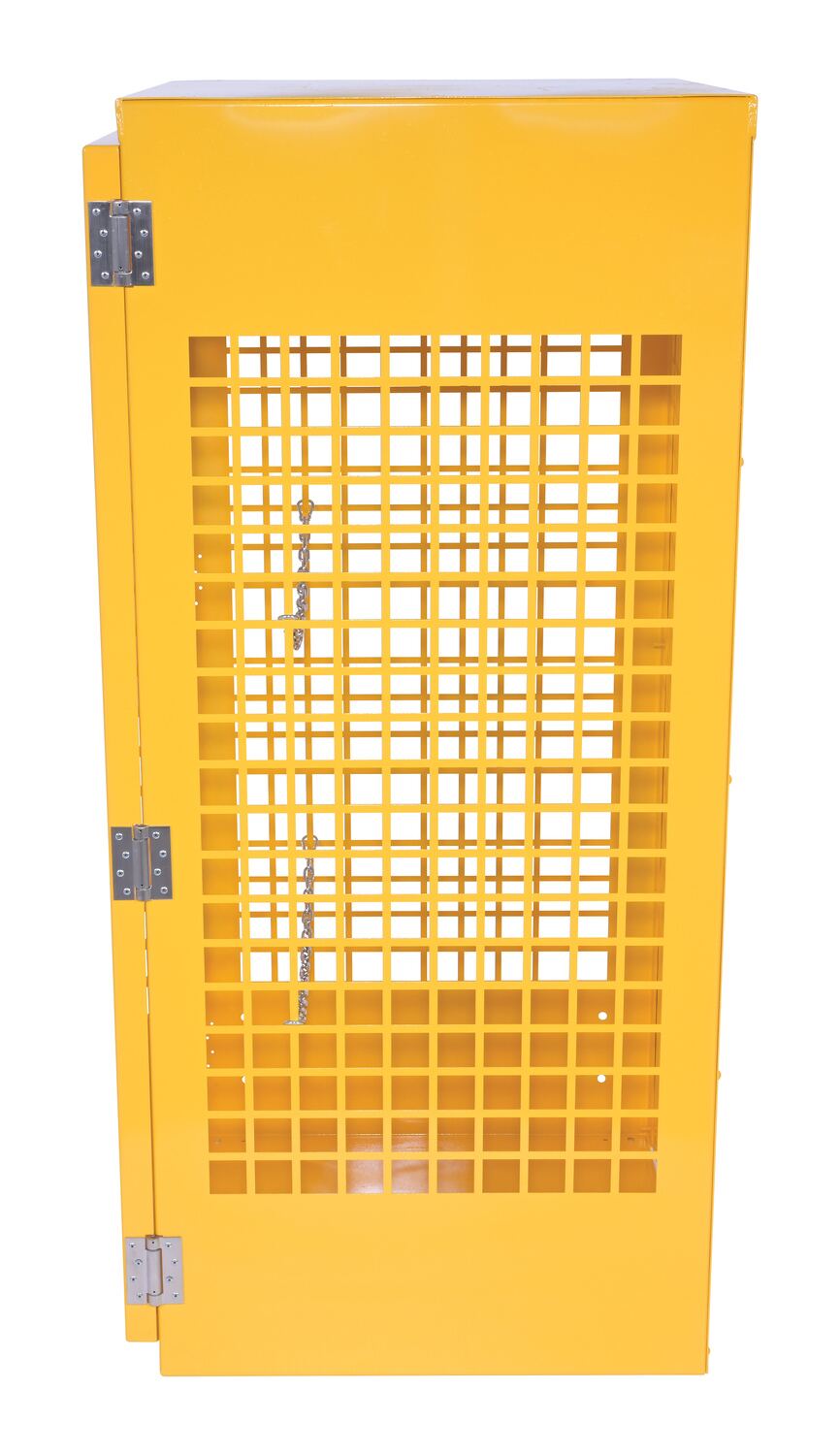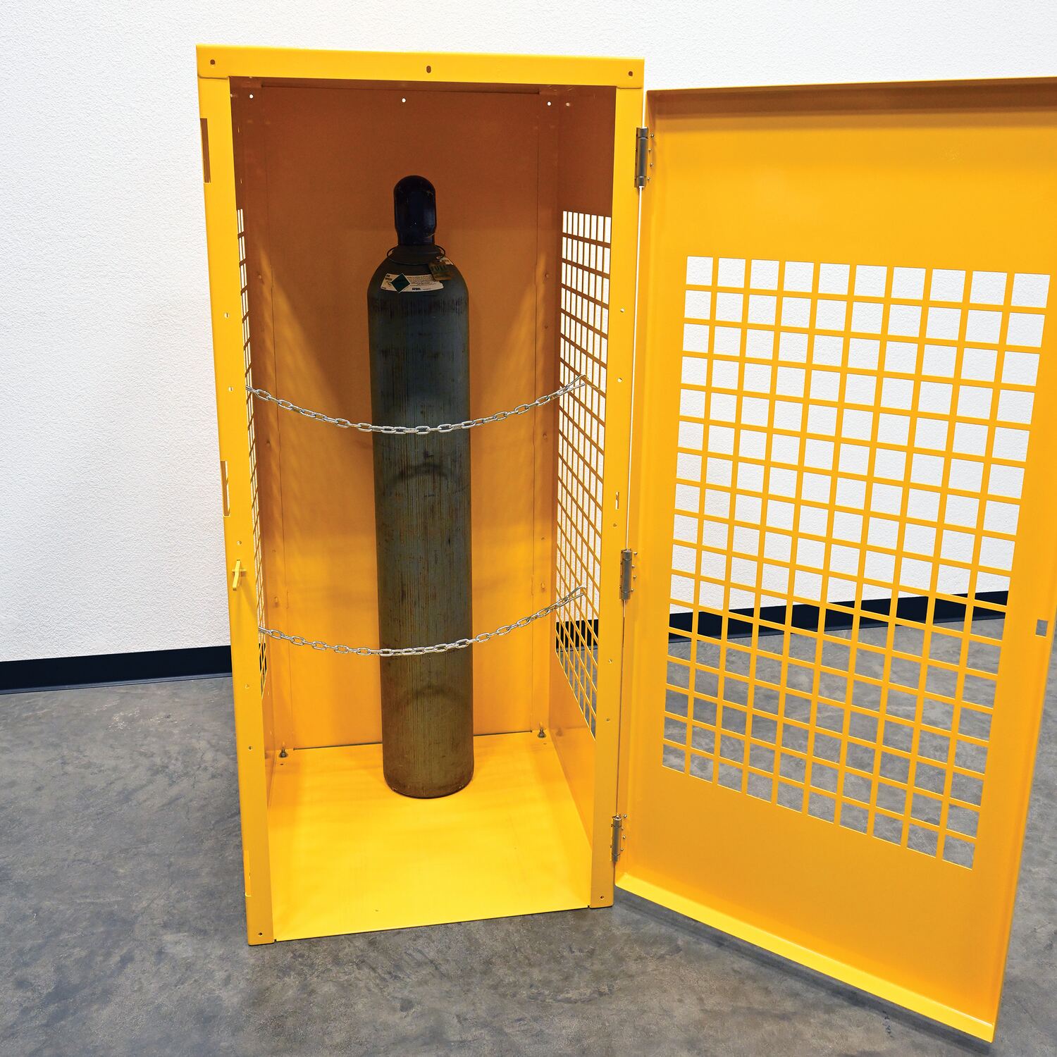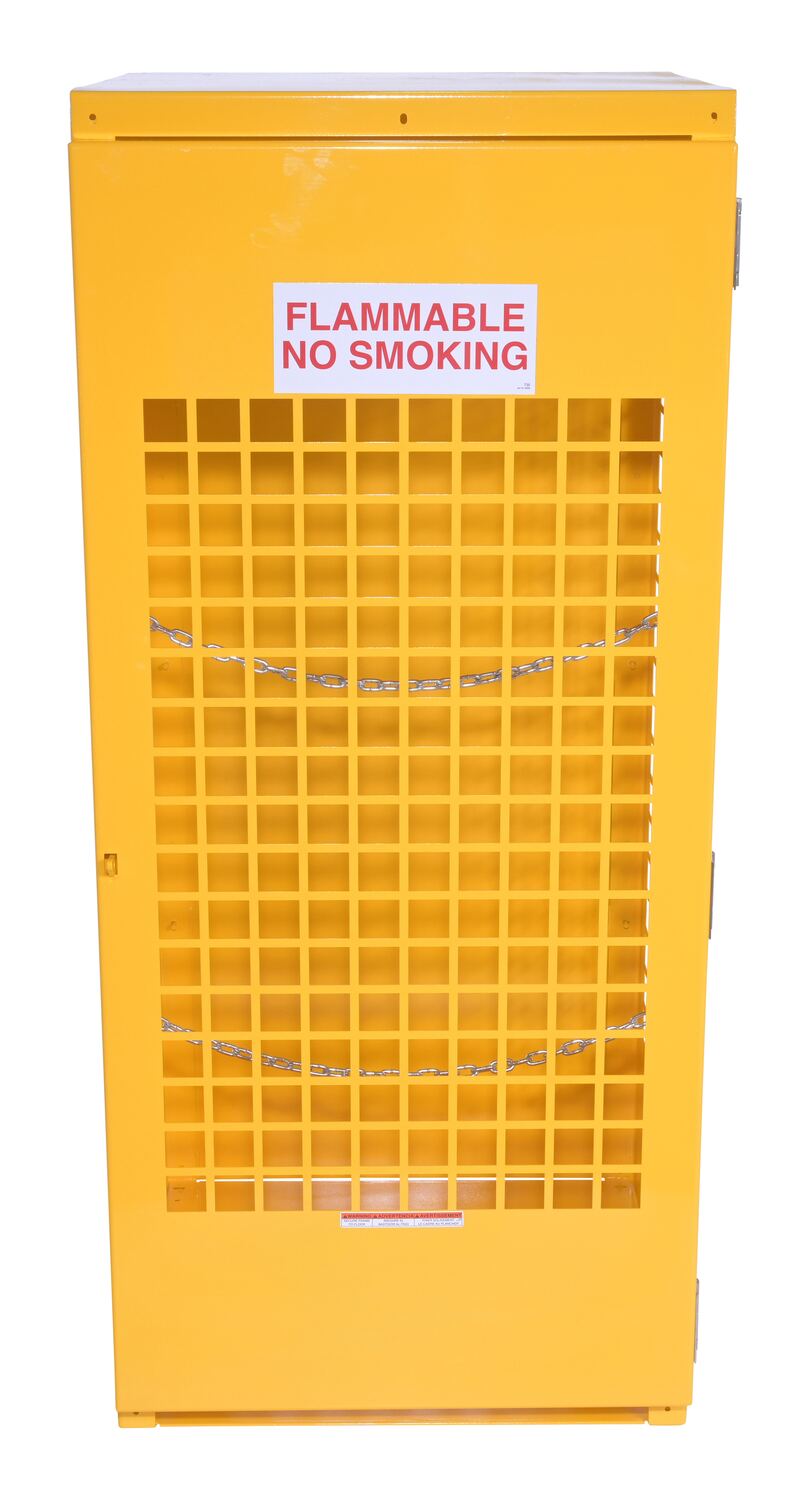 Steel cabinets for storage of cylinders. Cylinder storage capacity is based on cylinder size. Sides are made of expanded steel for an open view design. The top, back, and bottom is made of solid sheet steel. Lockable doors protect cylinders (padlock not included). Base includes lag holes for securing cylinders. Vertical units include chains for securing cylinders. Includes red lettered signage noting "Flammable-No Smoking" contents. Meets OSHA 1910.110 (f)(6)(ii), ANSI NFPA 55 + 58 and CGA P-1 design standards. Rugged steel construction with a baked-in powder coated safety yellow finish for toughness. Knock down versions available, suffix -KD Check out Vestil's Other Storage Cabinets: