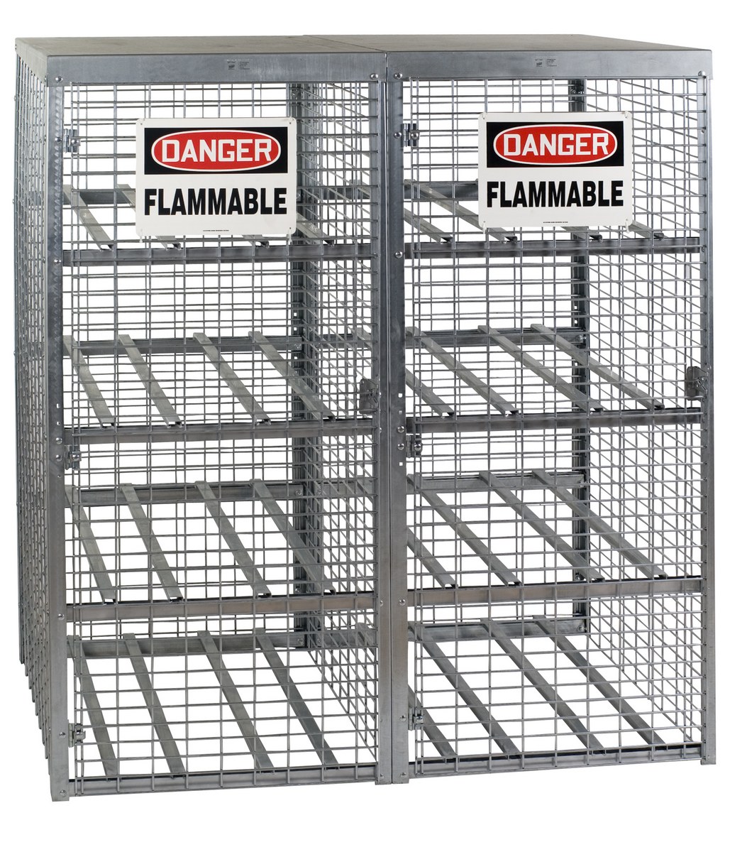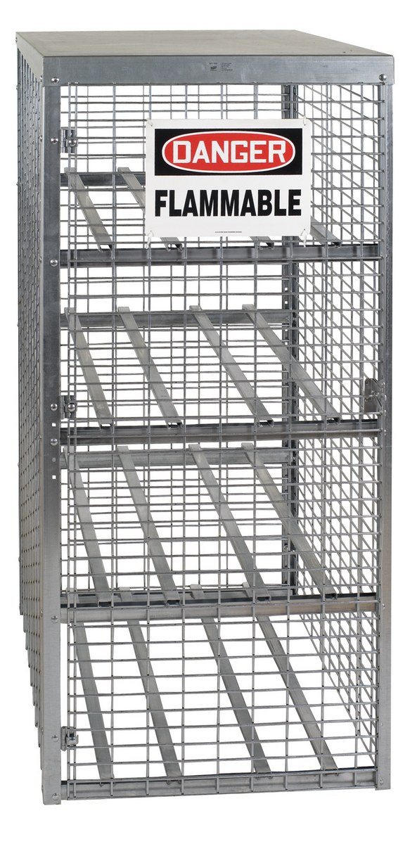 Store LP tanks horizontally and acetylene tanks vertically in these heavy-duty Cylinder Storage Cabinets. Made of all steel construction, these rust resistant units have 8 gauge galvanized welded wire sides with sturdy 1-1/2" square steel angle frames. Durable 18 gauge galvanized steel roof. The galvanized rust resistant finish stands up to harsh outdoor environments. Features a padlock hasp for security (padlock not included), "Danger Flammable Materials" sign, and all necessary hardware. Meets OSHA 1910.110 requirements. Assembly required.
