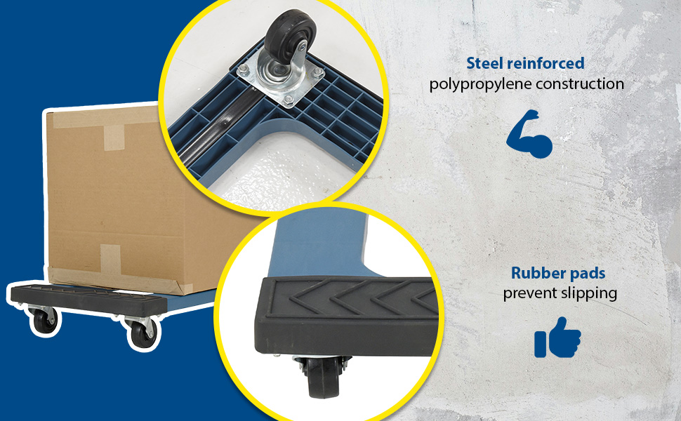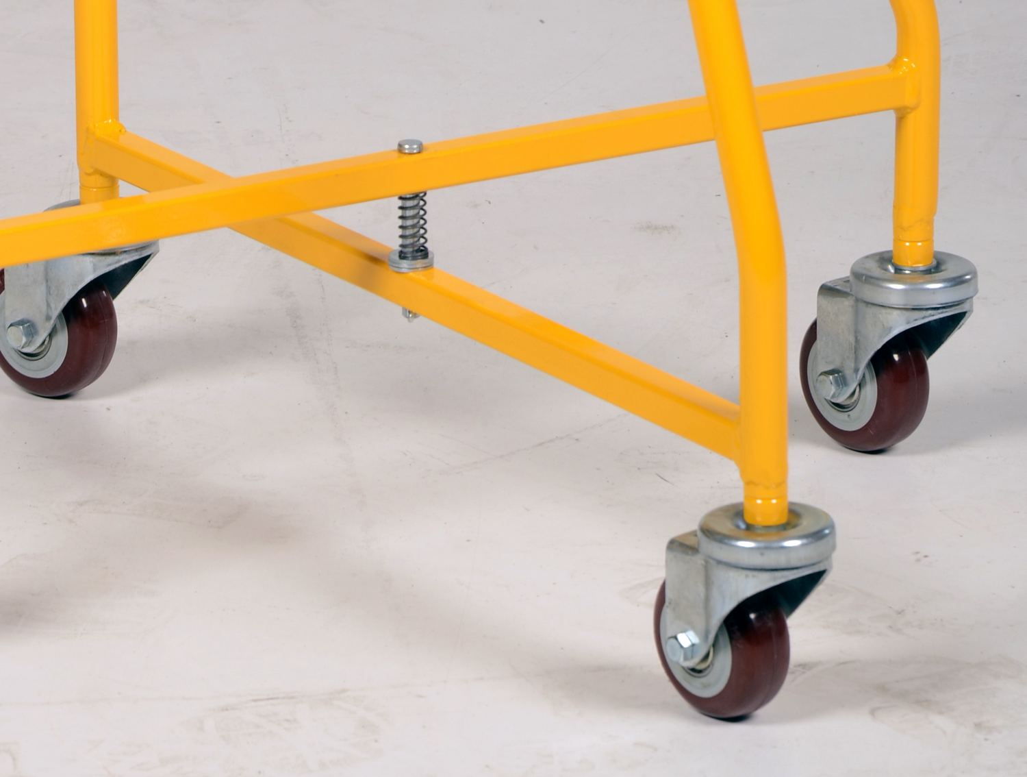 Unique dolly features elevated bucket/pail platform for better ergonomic position. Elevated platform allows for better posture during use, which leads to less fatigue and strain. For use with maximum 10-9/16" diameter round buckets. Also works with square buckets and boxes with maximum size 10-9/16" x 10-9/16". Design folds flat easily for storage when not in use. Portable on four (4) swivel poly casters. Steel construction with a yellow baked-in powder-coated toughness.