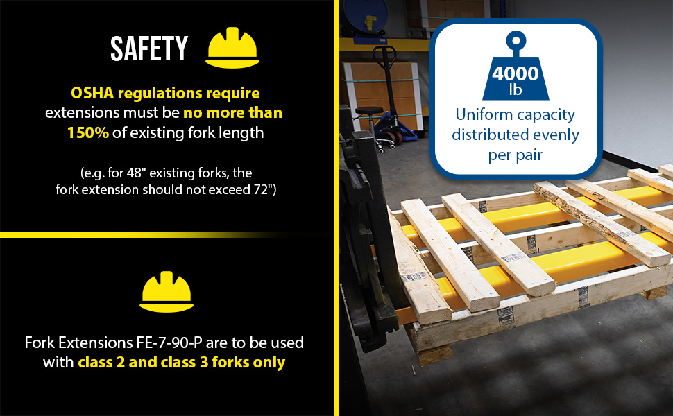 FE-4-96-P FE-4-96-PSteel Pin Style Fork Extensions 4 In. x 96 In. 4000 Lb. Capacity YellowUniform Capacity Per Pair (lb.): 4,000