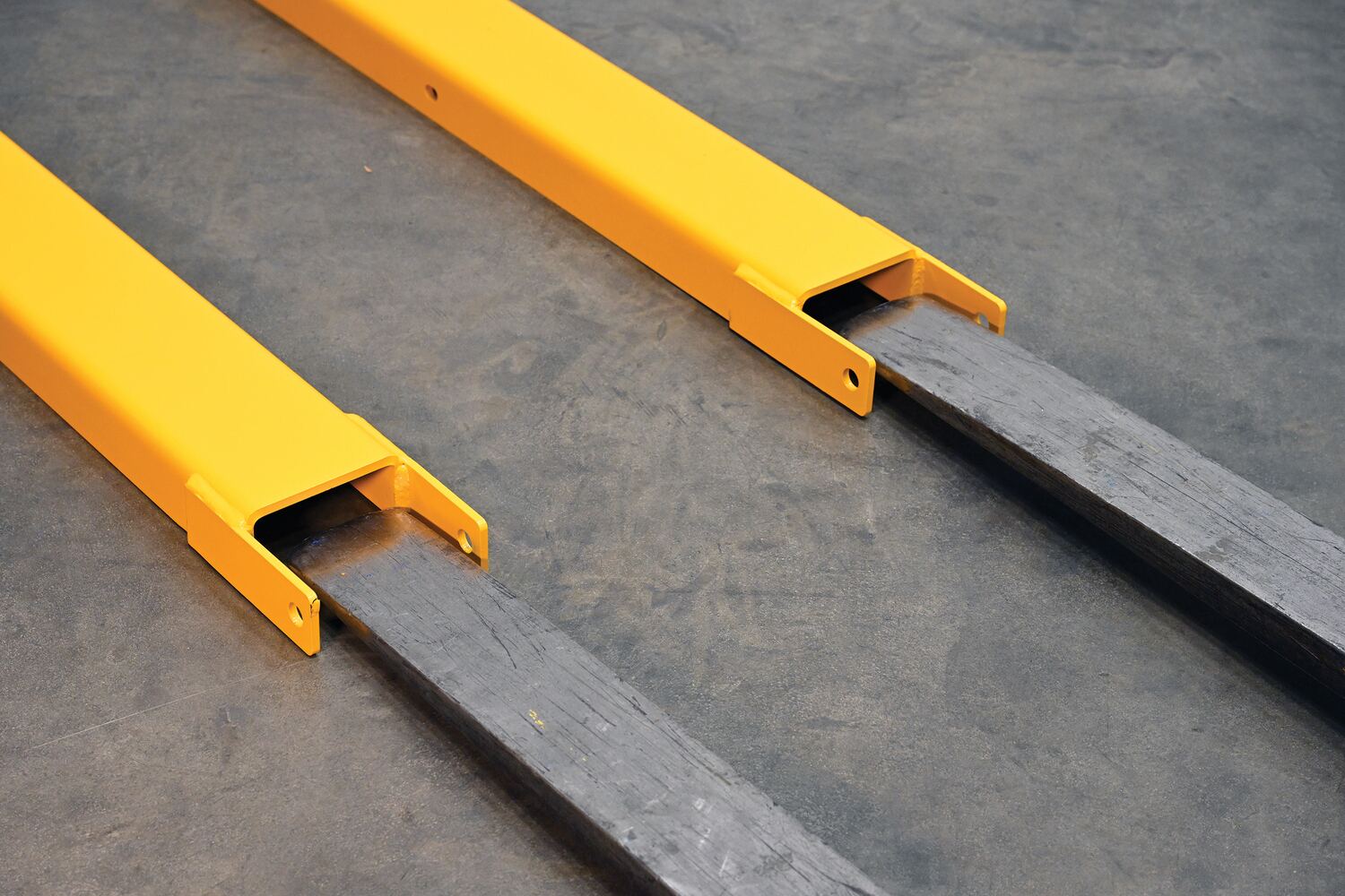 Provide the extra support needed to lift long or large objects with a fork truck. All model are designed of a welded steel construction. Models with prefix FE-4, FE-5 & FE-6 have cast steel tips, while models with prefix FE-7 and FE-8 have a tapered cut front end. Baked-in powder coat finish for added toughness. OSHA regulations require that extensions are no more than 150% of the existing fork length. (e.g. 48" existing forks, the fork extension should not exceed 72"). Maximum uniform capacity is 4,000 pounds evenly distributed per pair.