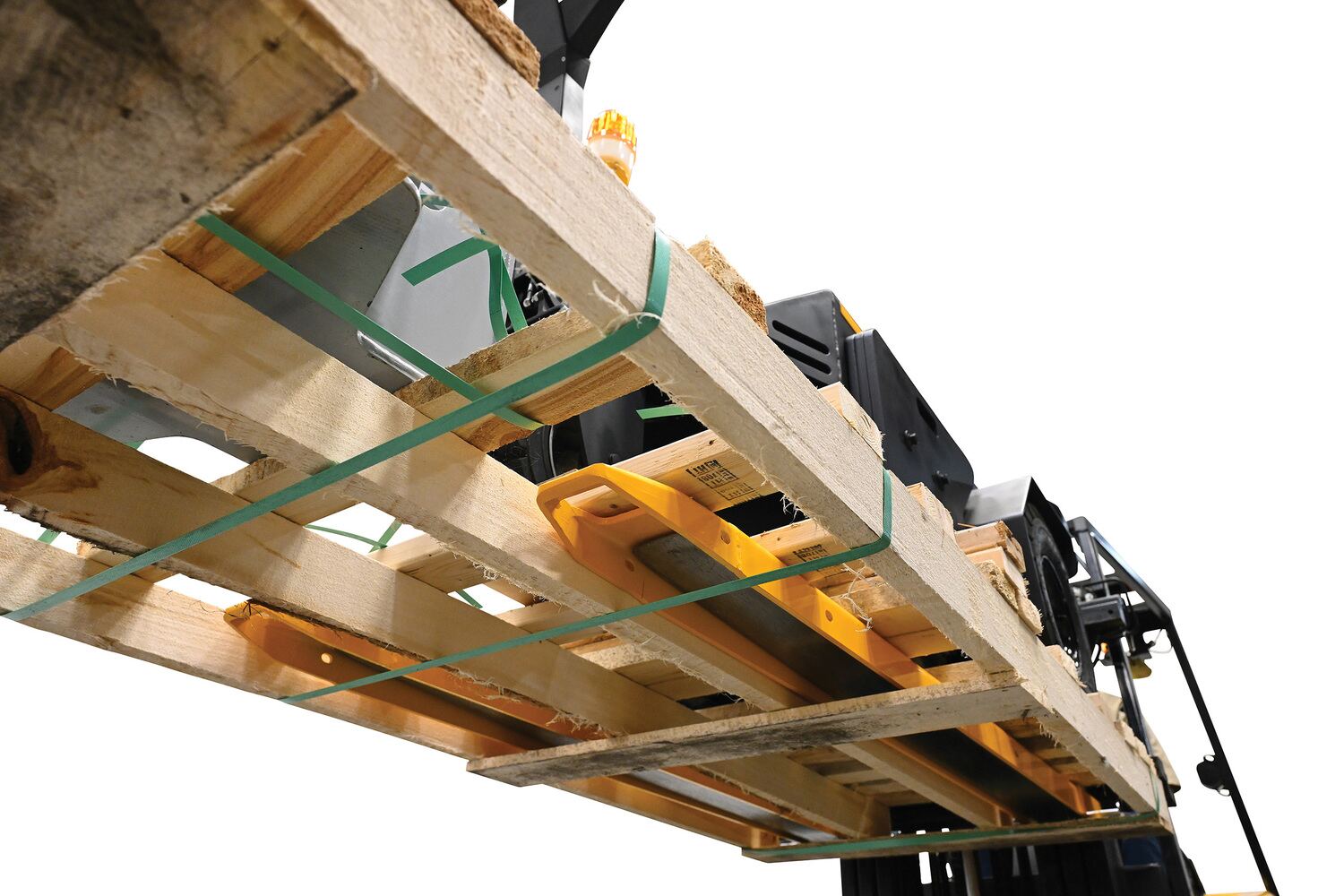 Remove pin and lay extension over fork or drive fork truck into the extension. Re-insert the pin behind the heel of the fork to secure extension.