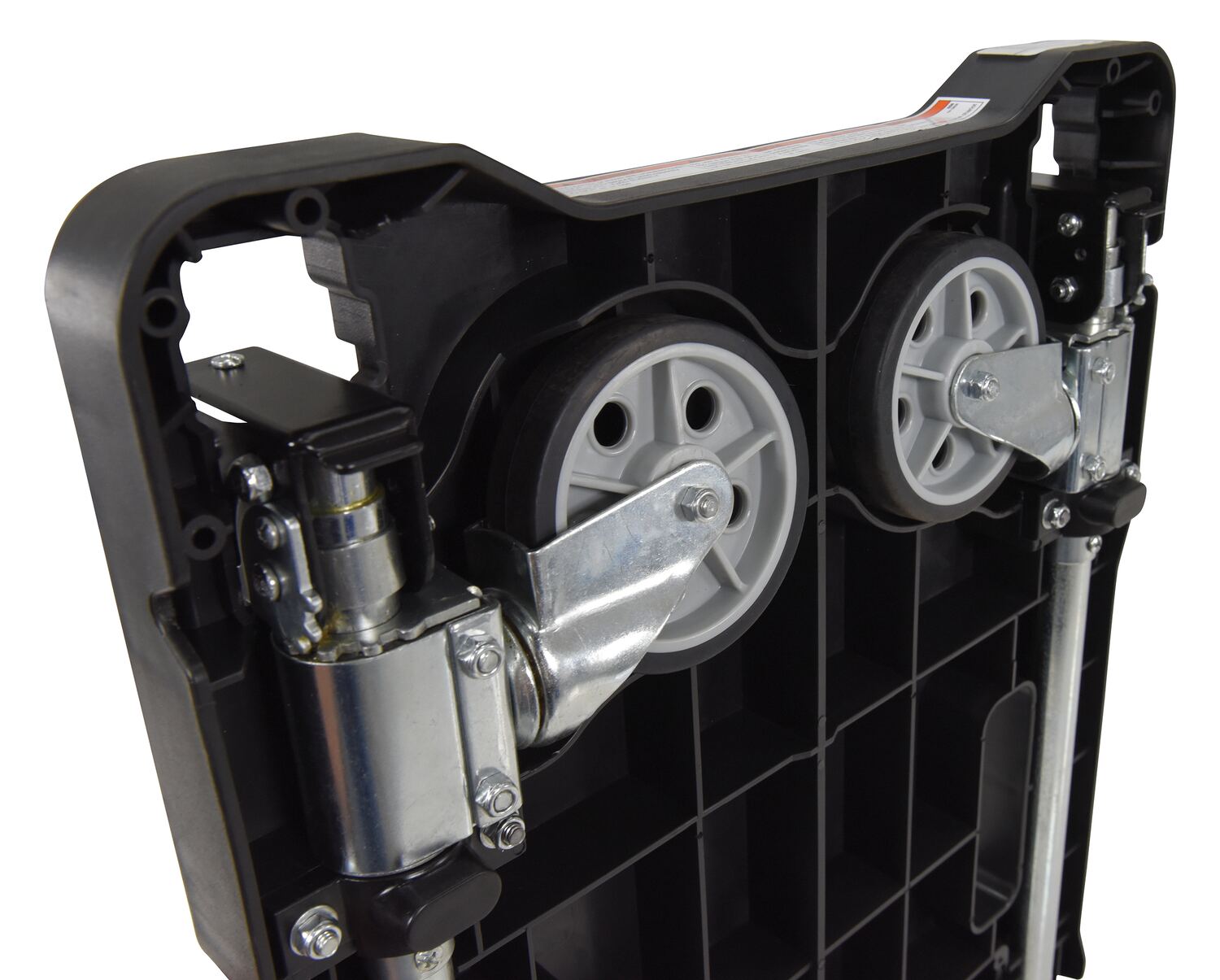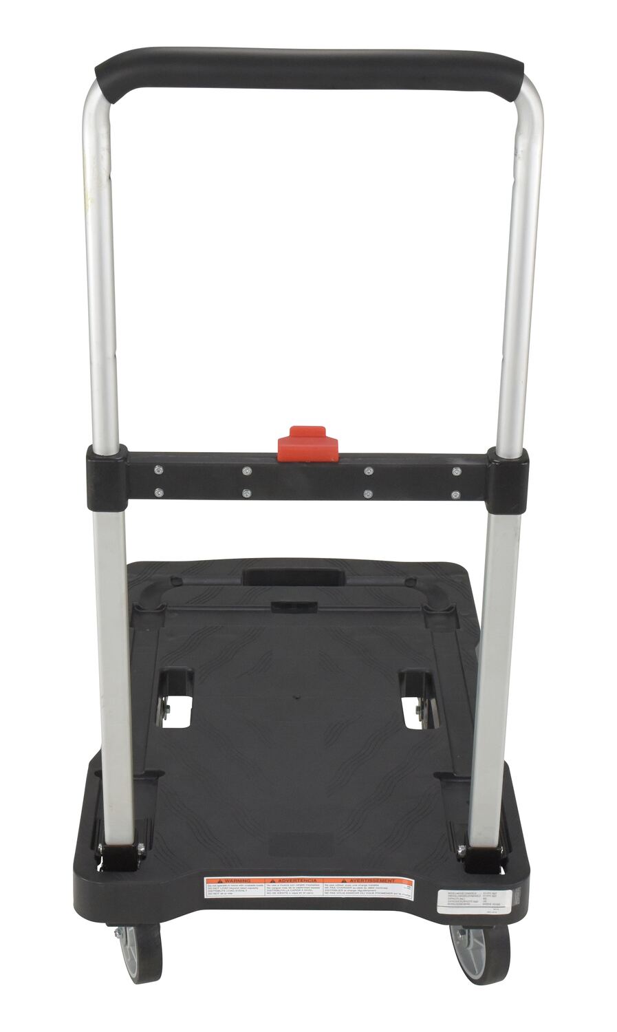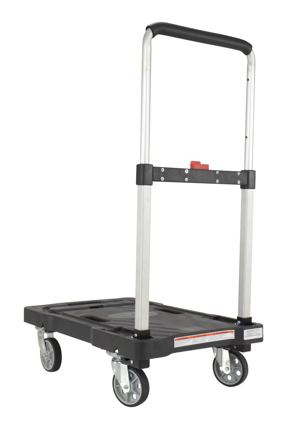 Unique cart folds completely flat for storage - telescopic handle folds down and casters fold up. Handle is adjustable to three different heights and features a cushion grip for comfort. Deck includes non-slip rubber grips and hand holes for easy carrying. Carts roll on two rigid and two swivel poly casters. Cart is constructed from plastic, steel and aluminum components.