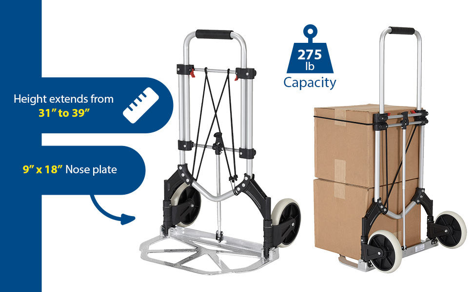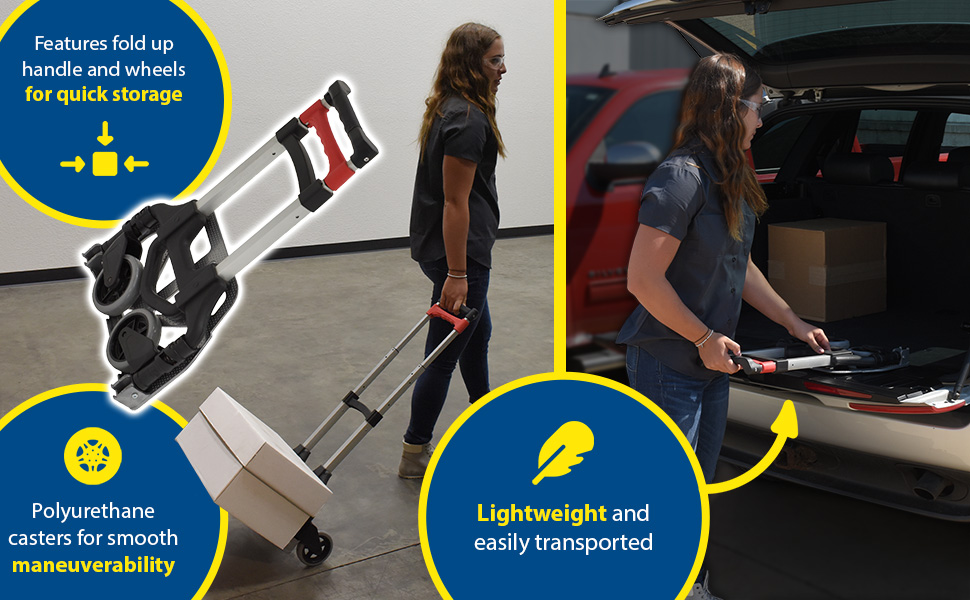 The Aluminum Fold-Up Hand Truck is designed for everyday, all purpose use. The handle and wheels fold up quickly and easily allowing you to store it in tight spaces such as trunks of cars, under tables, or in closets.