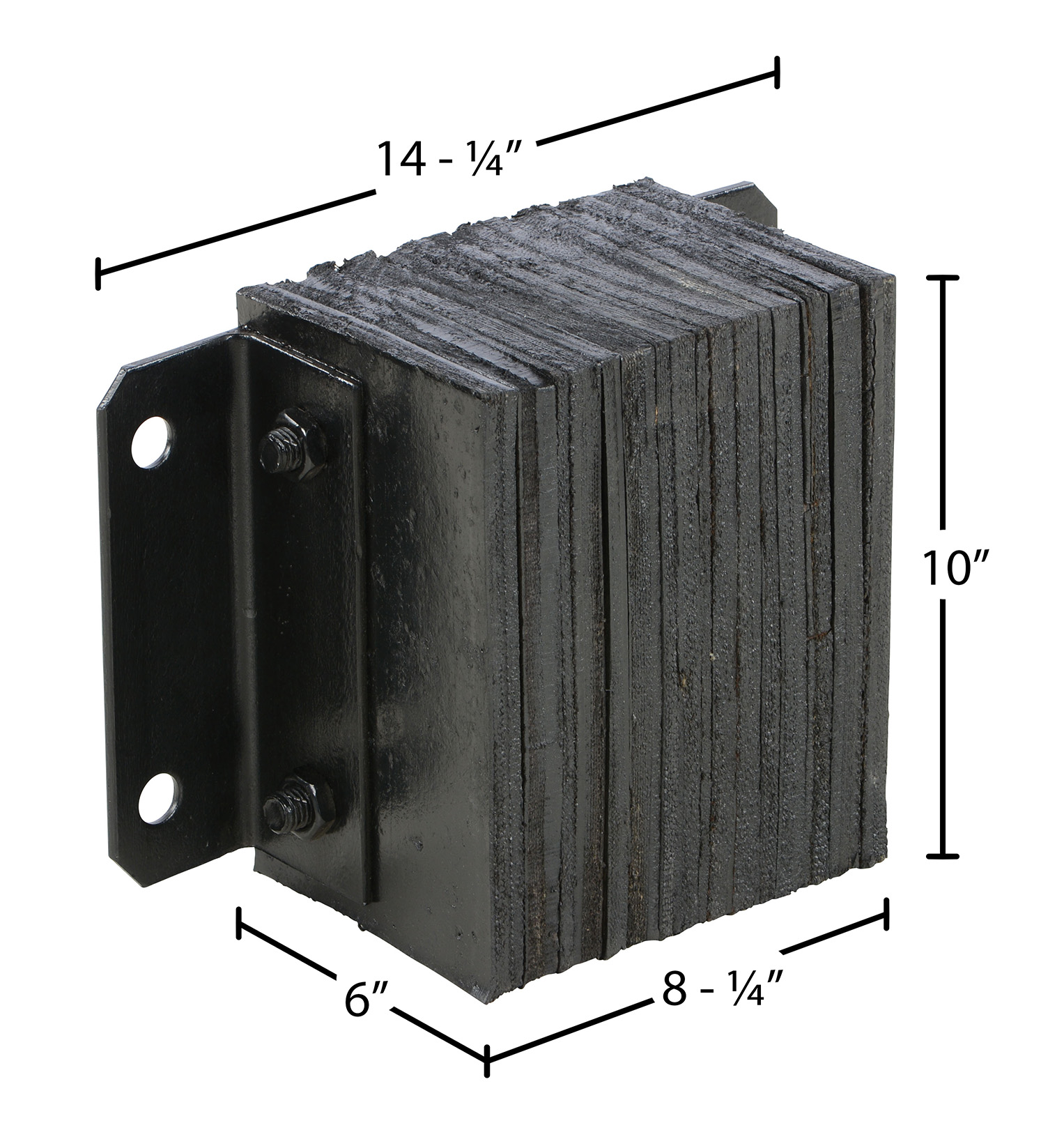The laminated Dock Bumper provides durable, economical protection for loading docks and trailers. This unit is constructed of fabric reinforced rubber from recycled truck tires. The pads are laminated between painted structural angles and held together with steel tie rods. The width is bolt hole center to bolt hole center. Installation hardware sold separately.