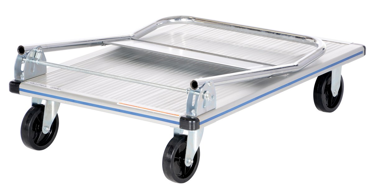 Use this Aluminum folding handle Platform Truck with non-marking casters for safe transportation of stacks of paper, small parts and other lightweight equipment. Ideal for maintenance rooms, offices, schools, hospitals, etc. Plastic corner protectors enhance durability and protect surroundings. The unit has a rugged aluminum construction with single handle design.