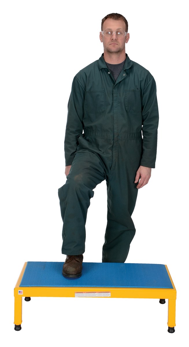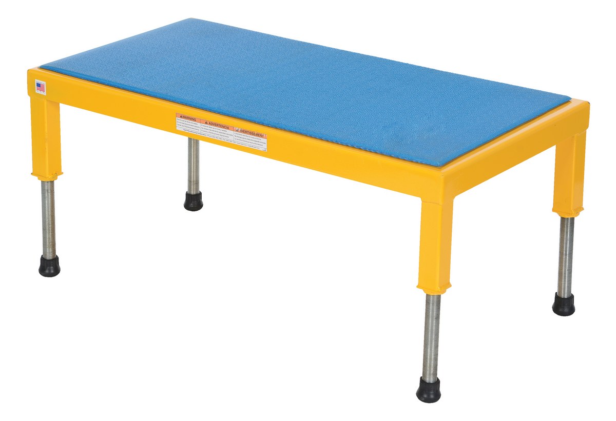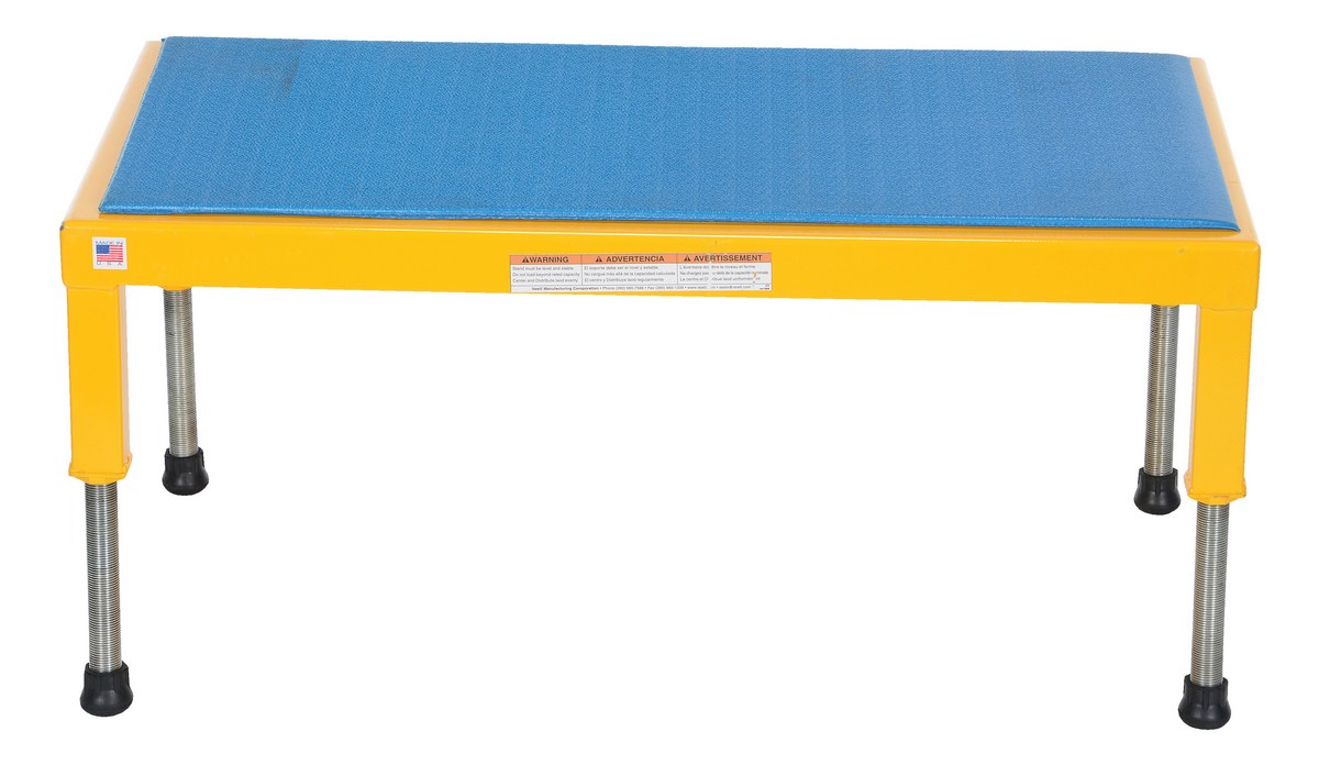 The adjustable work-mate stand minimizes fatigue by elevating workers to heights that are comfortable and ergonomically correct. Especially useful when multiple shift employees operate the same piece of machinery. The ergonomic matting deck style provides comfort for the operator who stands all day. The height of each leg can be adjusted individually to ensure proper working height.