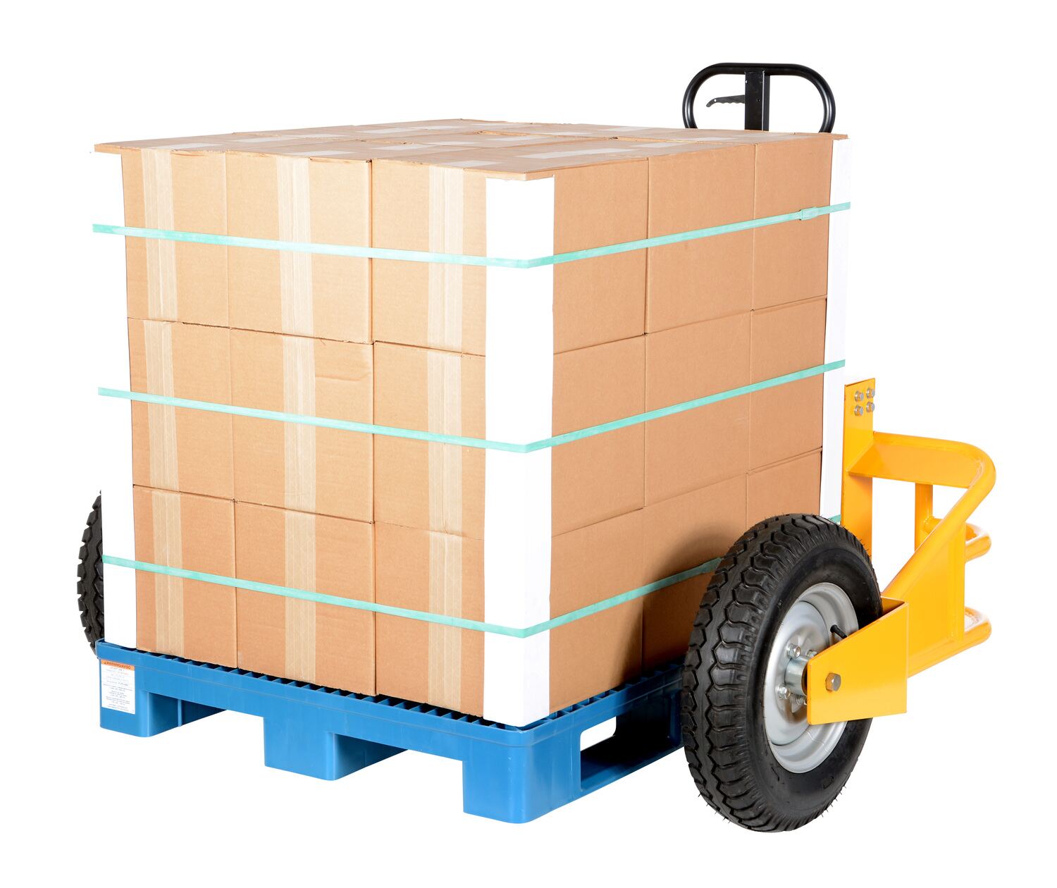The all terrain pallet truck is lightweight yet the strong tubular frame design handles evenly distributed loads. The large wheels allow for movement over most surfaces. Unit is great for use at construction sites, gravel pits, and nurseries. It's easy to operate with three position handle, up, down, and neutral. Unit rolls on pneumatic front tires and pneumatic steering wheels.