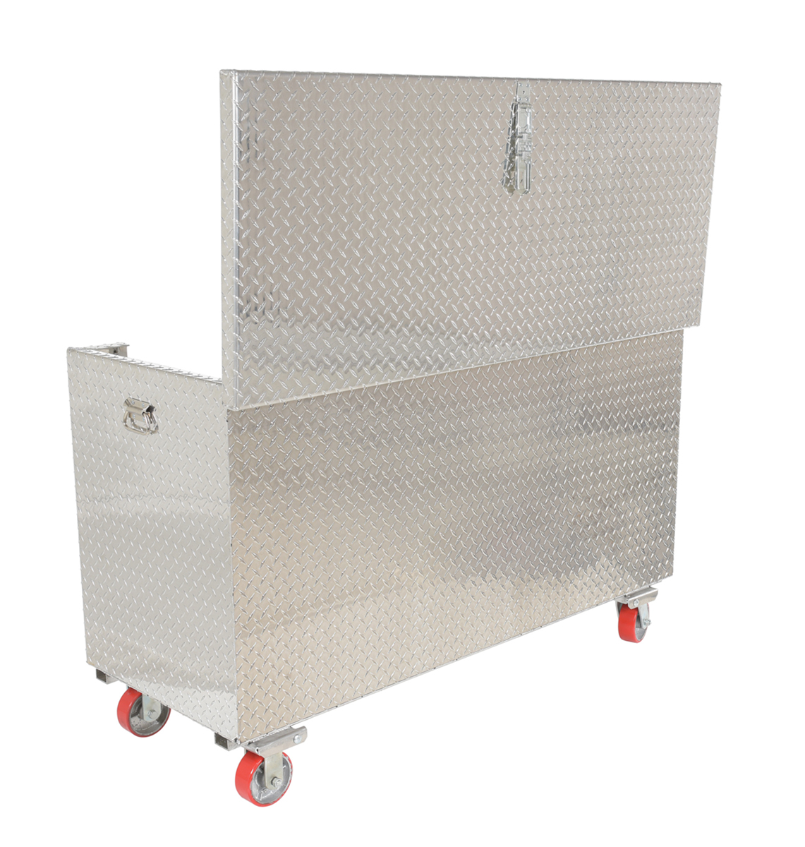 The Aluminum portable toolbox is excellent for storing and transporting equipment. The heavy duty welded aluminum tread plate construction is designed to tolerate the toughest of environments. Additional features also include ergonomically friendly carrying handles on each end for smooth manual transporting and a hinged lid which includes a lockable double hinged hasp for added security.