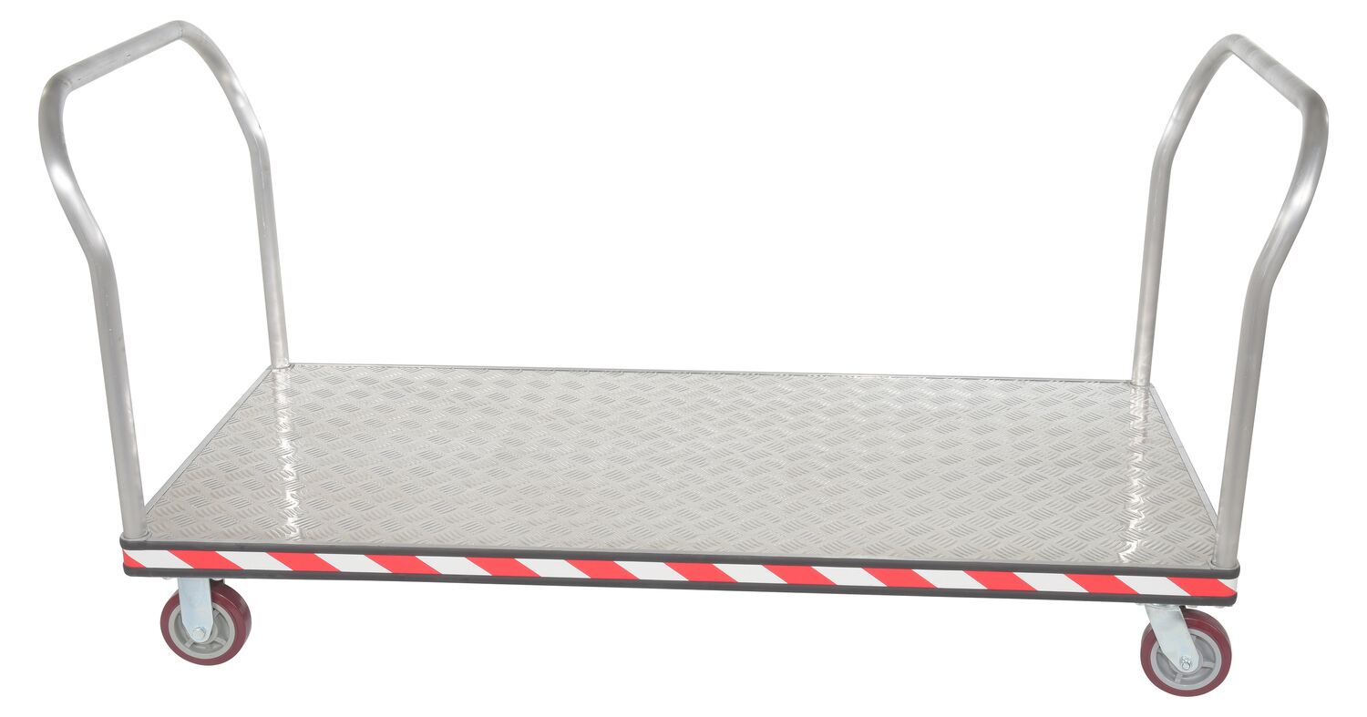 An aluminum tread plate platform truck is a great addition a variety of settings. Fitted with non-marking rubber protective buffer strip to protect walls and door frames during transit. Design allows items to be loaded and unloaded from multiple sides. The poly-on-poly casters roll smoothly over surfaces.