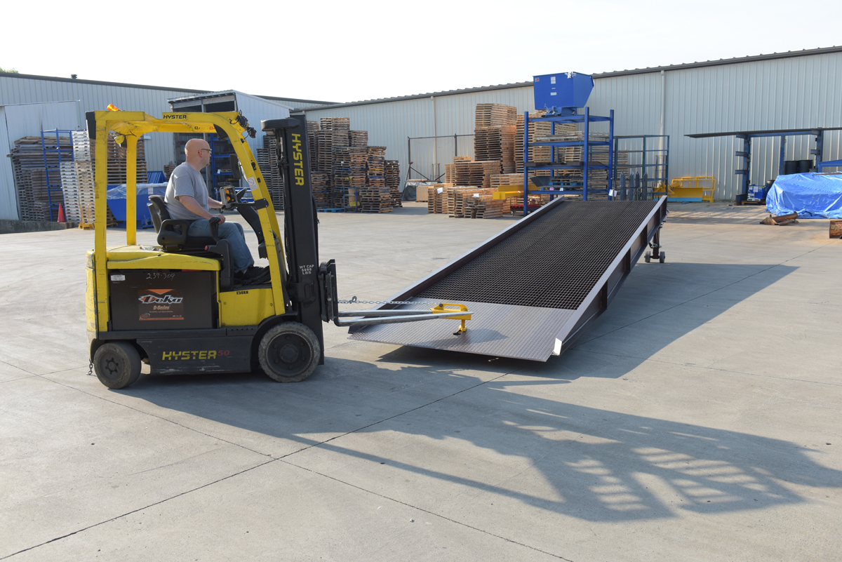 The tow bar pocket allows the user to utilize a fork truck or forked vehicle to maneuver the ramp into position more efficiently.