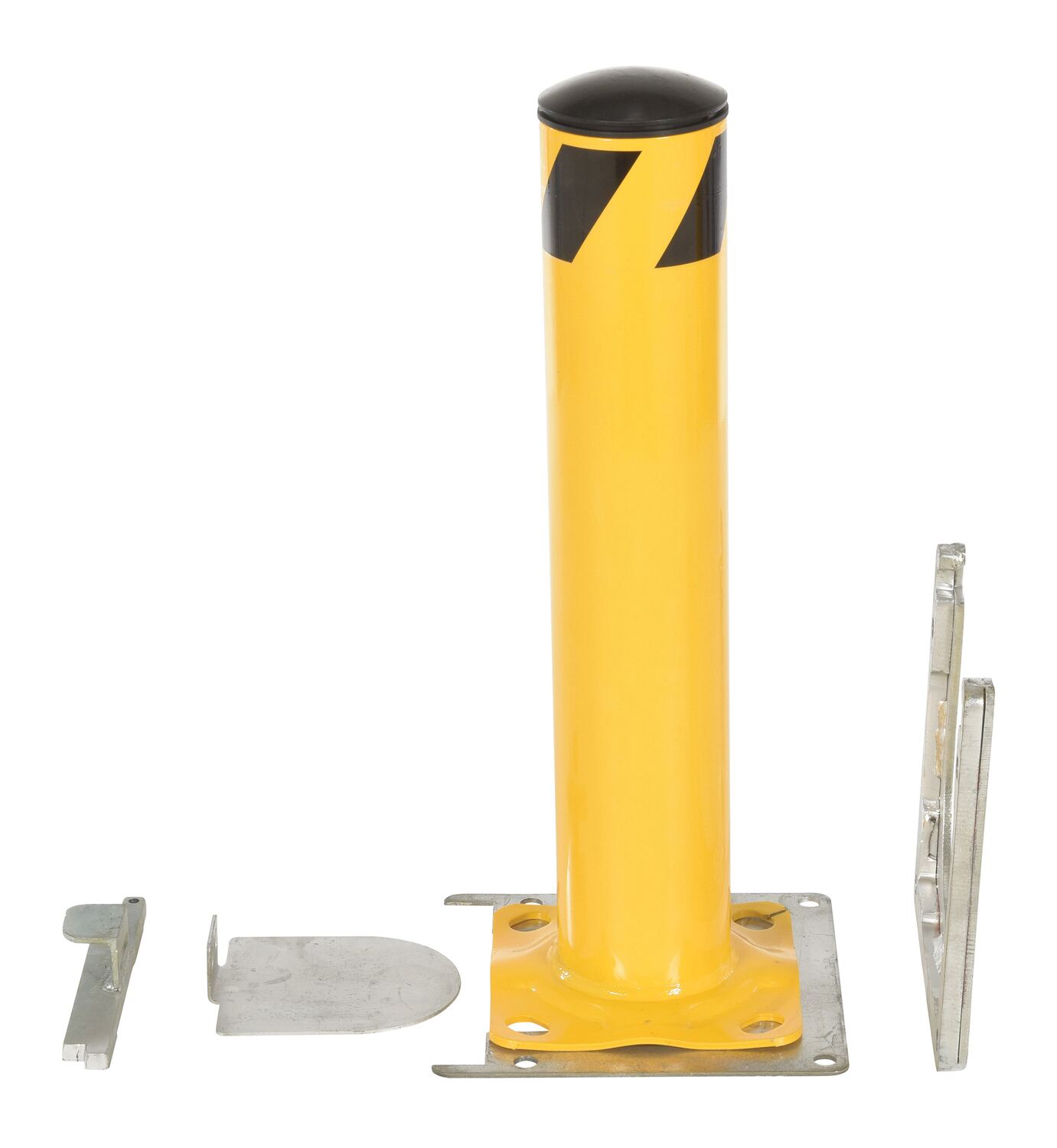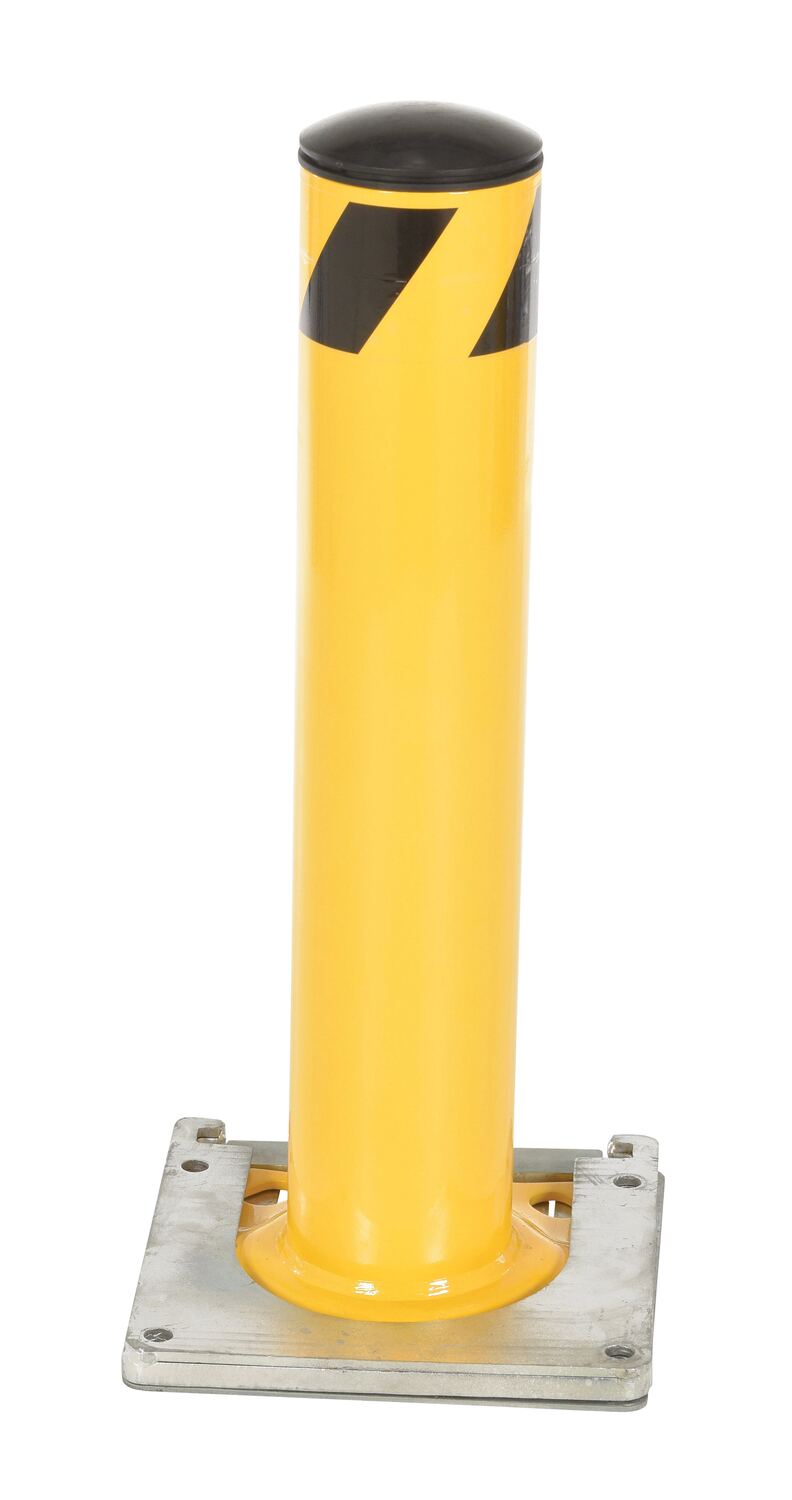 This steel pipe safety bollard can be used both indoors and outdoors to protect work areas, racking and personnel. Surface mounted steel base plate allows for quick and easy bollard removal. Steel base plate is bolted in place. Guard is easily inserted into base plate then locked in place. Base plate includes pre-drilled mounting holes. Plastic caps are removable. Powder coated safety yellow finish. Welded steel construction.