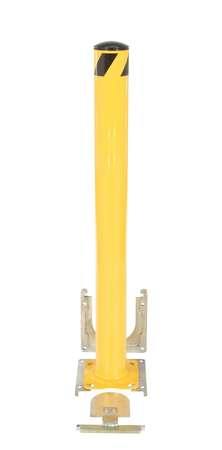 Steel Surface Mounted Removable Pipe Safety Bollard 48 In. x 4-1/2 In. YellowThis steel pipe safety bollard can be used both indoors and outdoors to protect work areas, racking and personnel. Surface mounted steel base plate allows for quick and easy bollard removal. Steel base plate is bolted in place. Guard is easily inserted into base plate then locked in place. Base plate includes pre-drilled mounting holes. Plastic caps are removable. Powder coated safety yellow finish. Welded steel construction.