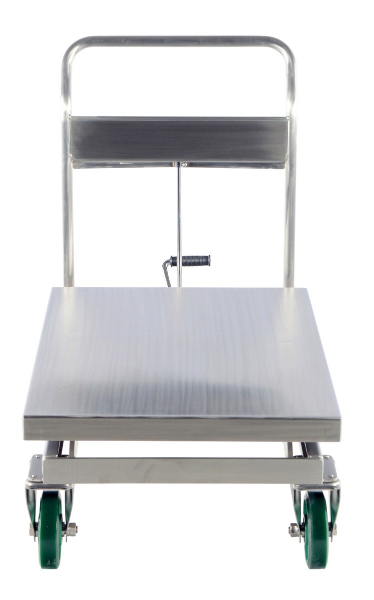 Stainless Steel Hydraulic Scissor Cart 35-1/2 In. x 23-1/2 In. 1100 Lb. Capacity SilverThe Hydraulic elevating cart minimizes worker bending and lifting through its ergonomic design and portability. Material can be easily loaded onto a cart from a table, lowered to a safe transporting height, and raised to unload at destination. The foot pump includes a soft-lowering down valve. The unit moves easily on four polyurethane casters; two swivel with brakes and two rigid. Features a two-speed foot pump. Foot pump pedal, pump assembly and hydraulic cylinder are chrome plated. Rest of the unit is fully stainless construction. Features an internal safety velocity fuse in each cylinder.