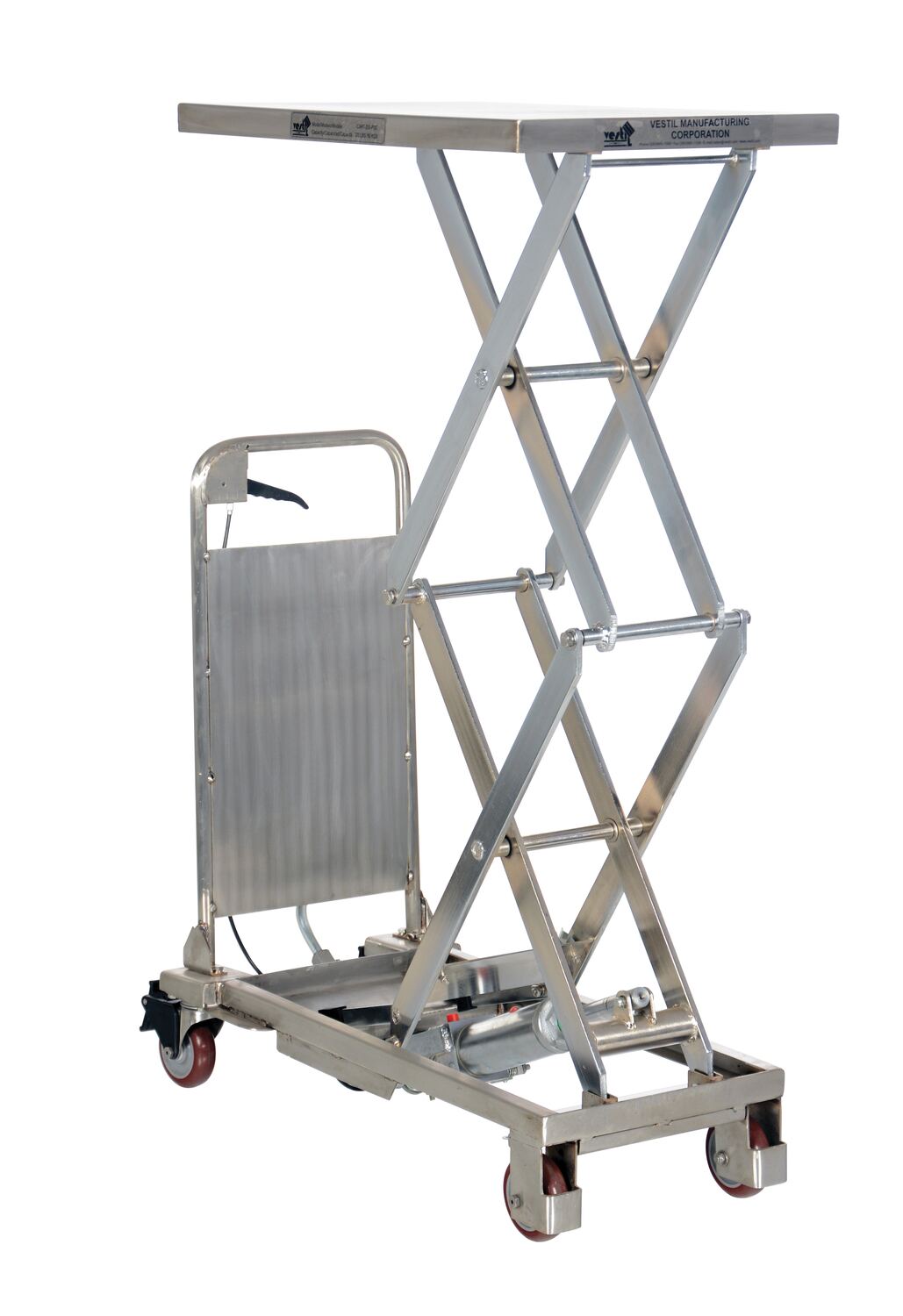The partially Stainless Steel Hydraulic elevating cart is available for transport heavy loads in lab, food service and health care applications. Not suitable for wash-down applications. The platform. Handle, base frame, caster rig and hardware are 304 grade stainless steel. Foot operated hydraulic pump raises platform. To lower unit use the hand-operated release. The wheels are poly-on-poly. Features an internal safety velocity fuse in each cylinder.