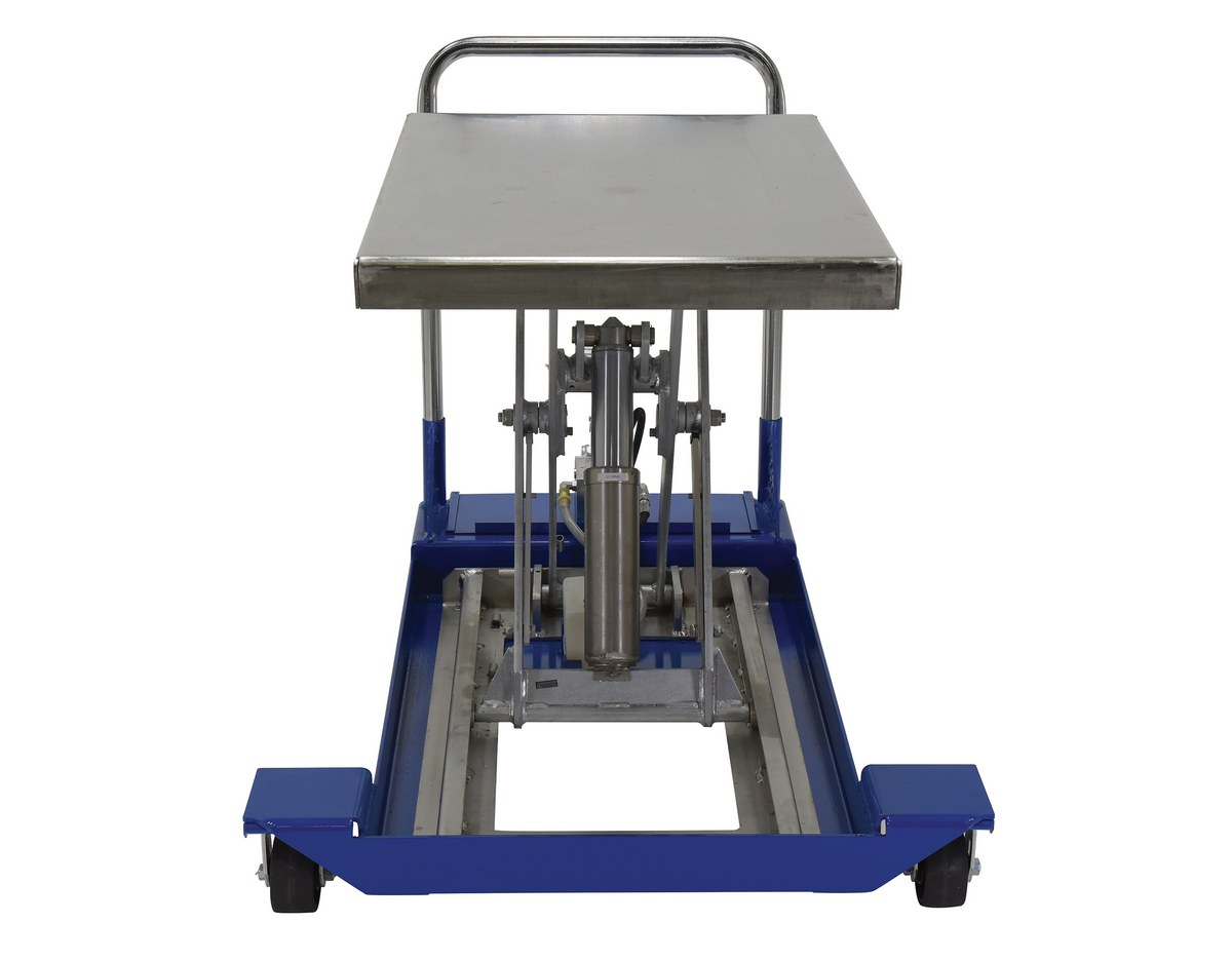 Partially Stainless Steel Foot Pump Scissor Cart 36 In. x 24 In. 1500 Lb. Capacity Blue/SilverThe manually powered Scissor Cart table provides an unparalleled support in lifting, palletizing, loading, and unloading applications. The high handle allows the user to maneuver the cart with ease while minimizing an improper ergonomic position. The cart is raised or lowered with a manual two-speed foot pump. The unit rolls smoothly on two rigid and two swivel casters. While the smooth finish allows the user to place fragile items without the fear of getting scratched, scuffed, or damaged.