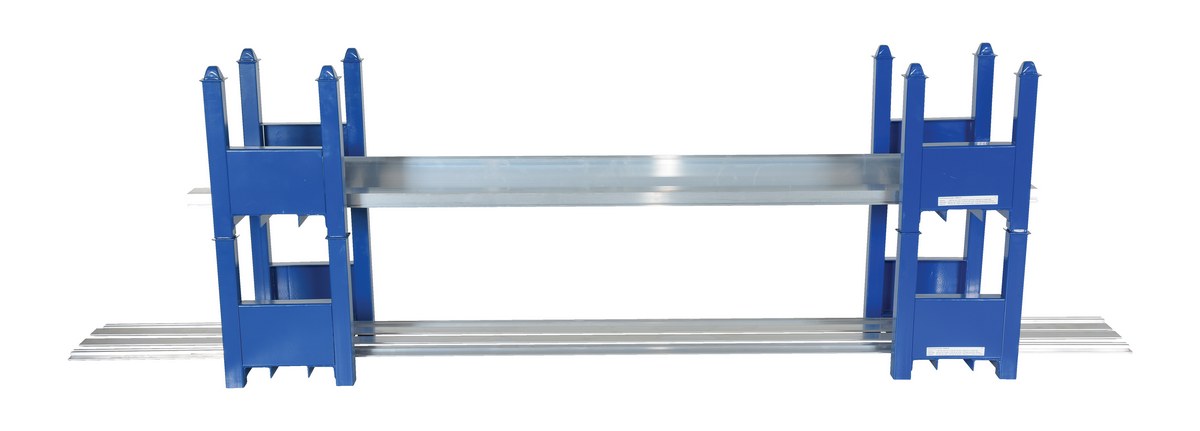 Stackable bar cradle; a sturdy welded steel rack that is strong enough to handle heavy loads. Allows for custom design by choosing length, depth, and height of individual storage systems. Welded steel construction with blue painted surface.