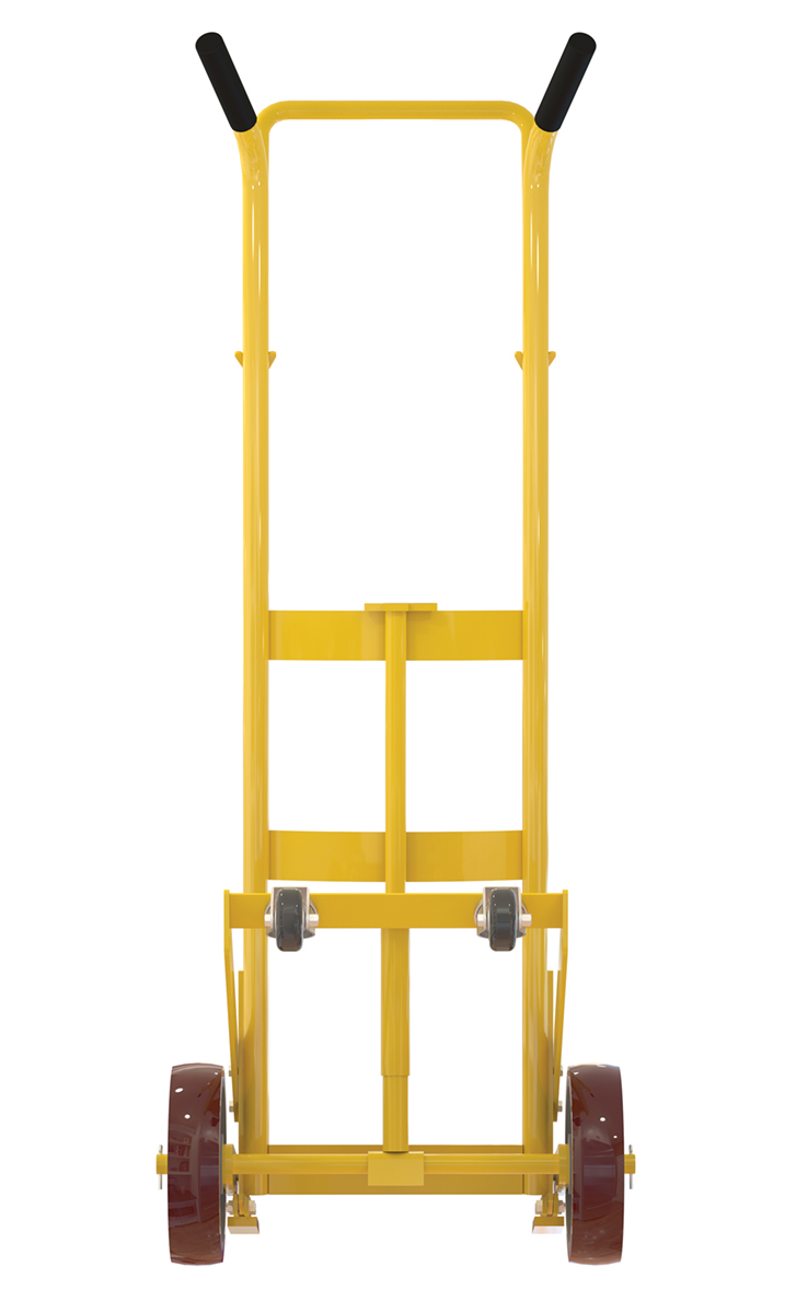 Designed for moving 55 gallon steel drums. Features a spring mechanism, which allows for easier tilting of fully-loaded drums. Four-wheel design for easier drum transportation when tilted. Top loop handle allows for easier control when moving. Drum is secured to truck with an adjustable height drum hook bar. Removable drum hook bar includes built-in bung nut wrenches. Capacity is 1,000 pounds. Steel construction with powder coat finish.
