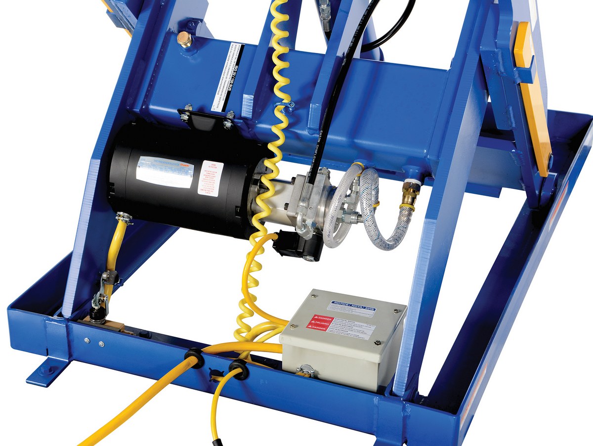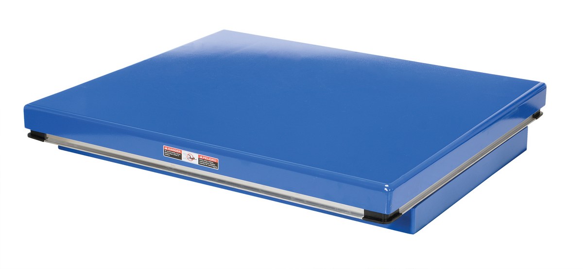 The electric hydraulic scissor lift table is used by all types of manufacturing and warehouse facilities. Safety features include a patented pinch point perimeter toe guard to protect pinch points while lowering the table, fused push button control, internal safety velocity fuse to maintain platform height in the event of hose or fitting failure, integral maintenance prop, adjustable upper travel limit switch to stop the table at maximum height, and displacement-style hydraulic cylinders for maximum strength. It also features a pressure plated pump, manifold system, and state-of-the-art lifetime lubricated bearings. The standard 56 frame electric motor is fully enclosed with additional voltage options available. Contact factory if platform dimensions are crucial.