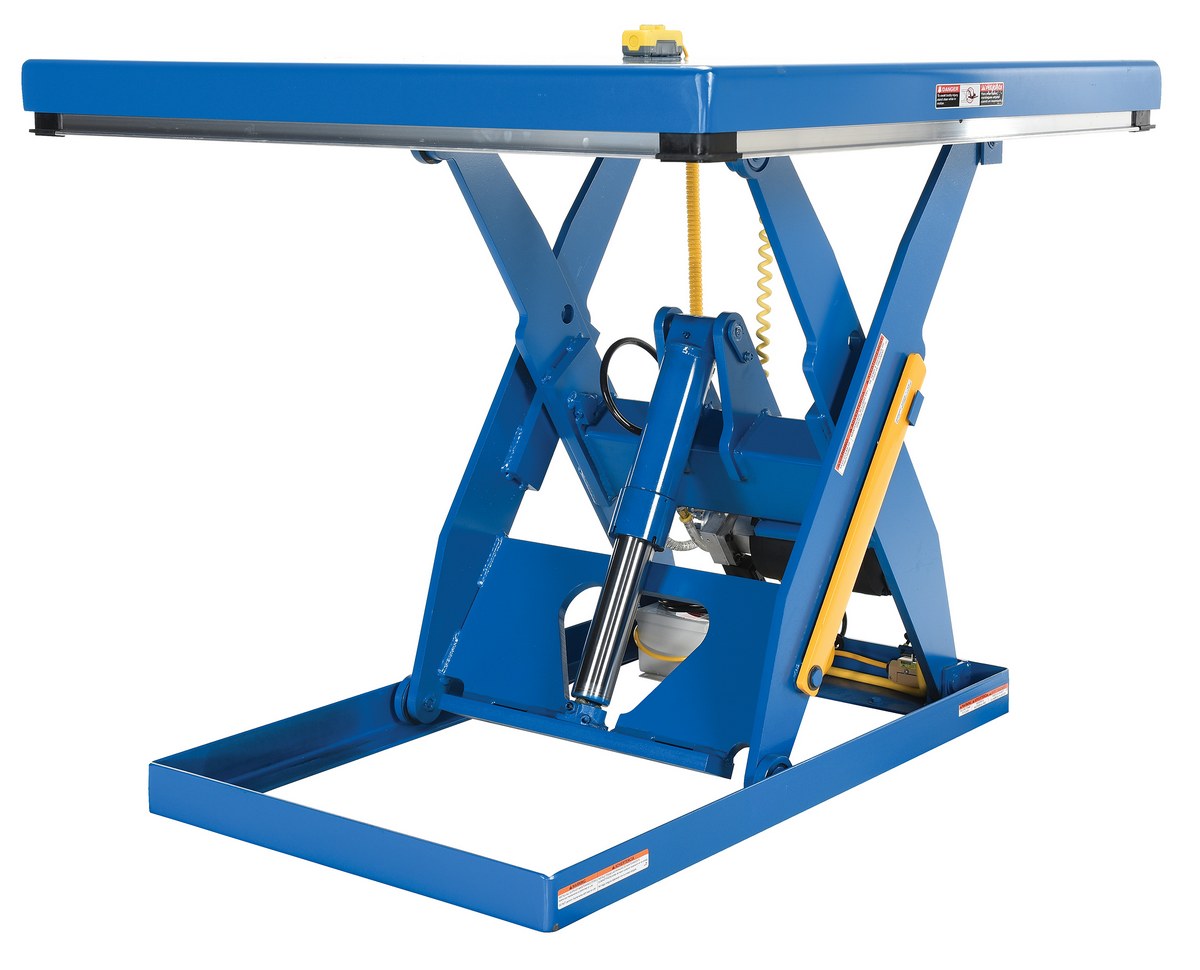 The electric hydraulic scissor lift table is used by all types of manufacturing and warehouse facilities. Safety features include a patented pinch point perimeter toe guard to protect pinch points while lowering the table, fused push button control, internal safety velocity fuse to maintain platform height in the event of hose or fitting failure, integral maintenance prop, adjustable upper travel limit switch to stop the table at maximum height, and displacement-style hydraulic cylinders for maximum strength. It also features a pressure plated pump, manifold system, and state-of-the-art lifetime lubricated bearings. The standard 56 frame electric motor is fully enclosed with additional voltage options available. Contact factory if platform dimensions are crucial.
