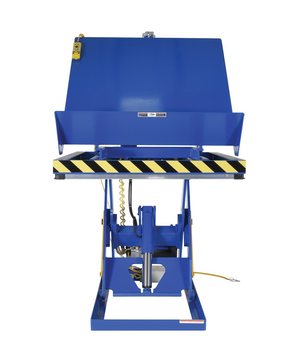 The lift and tilt scissor lift performs both lifting and tilting operations. There is a restraining chain and lip to keep the load in place during tilting. Safety features include an electric toe guard to protect workers from pinch points during lowering of the table, velocity fuses to hold platform position in the event of a hose or fitting failure, four (4) push-button hand pendent control, upper limit switch to stop travel at maximum height and reduce motor wear, and maintenance prop. The end tilt is standard with a side tilt available. There is optional accordion skirting available for both the lifting and tilting portions of the table.