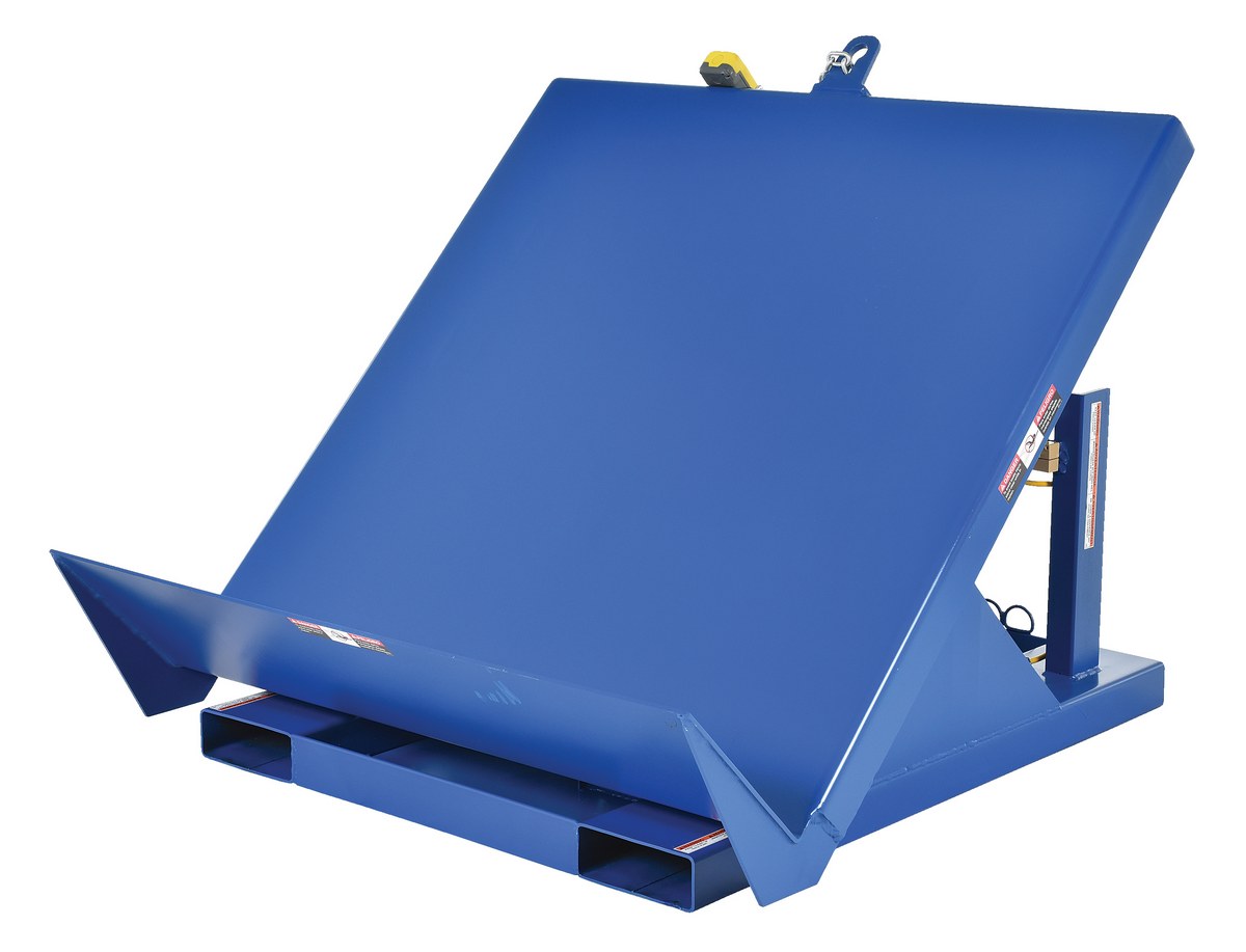 Steel Efficiency Master Tilt Table 48 In. x 48 In. 4000 Lb. Capacity BlueThe efficiency master tilt table tilts pallets, crates, boxes, or baskets to facilitate easy container loading or unloading. The table features all welded steel construction for years of durability. The unique design minimizes pinch points to meet OSHA requirements. This tilt table is equipped with an industrial quality motor that delivers the best torque with minimal amperage draw for maximum life. Standard voltage is 460/3PH, with additional voltage options available. The tilt table has a standard push button hand control. Base includes fork pockets for portability with forklift.