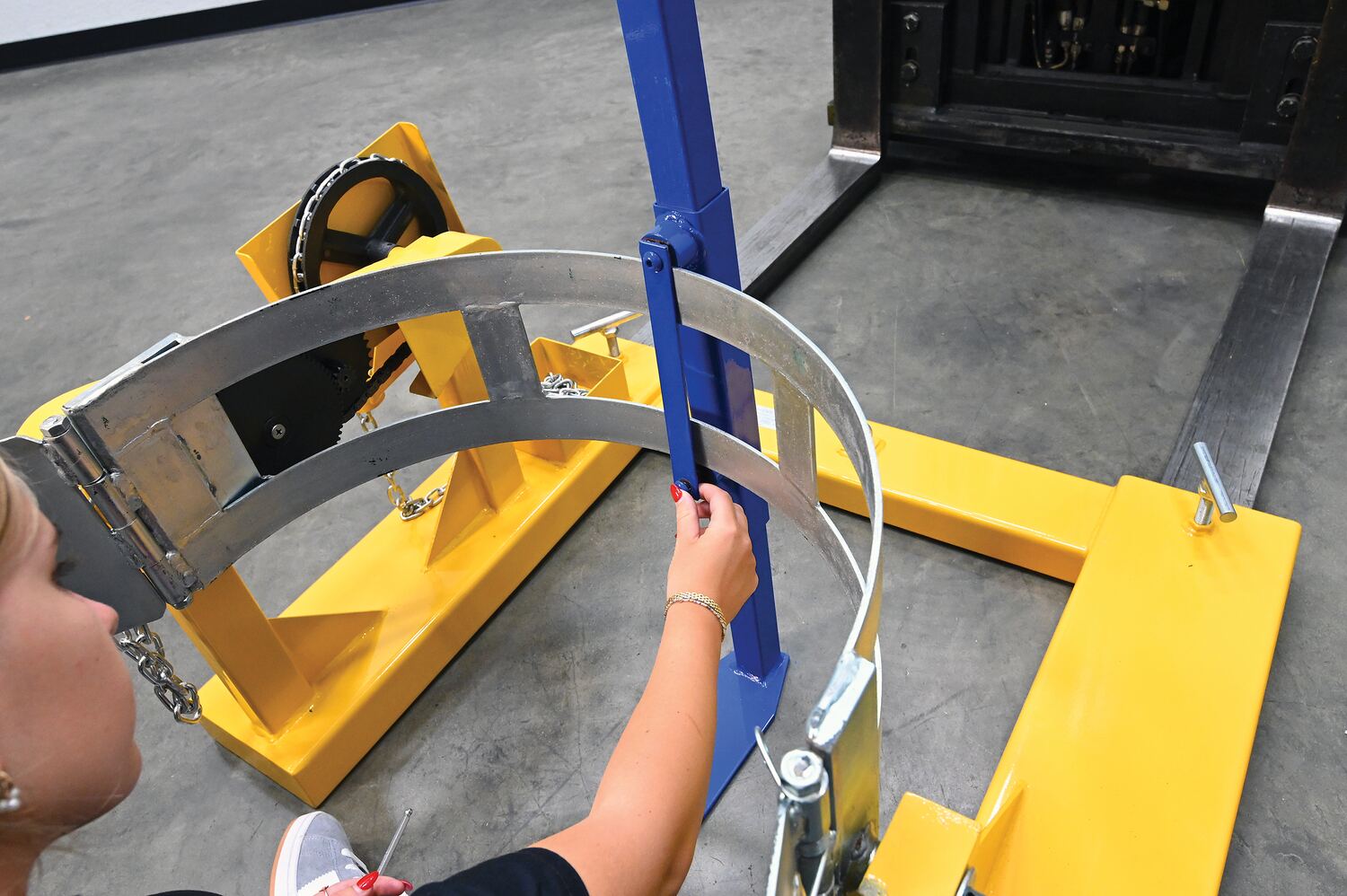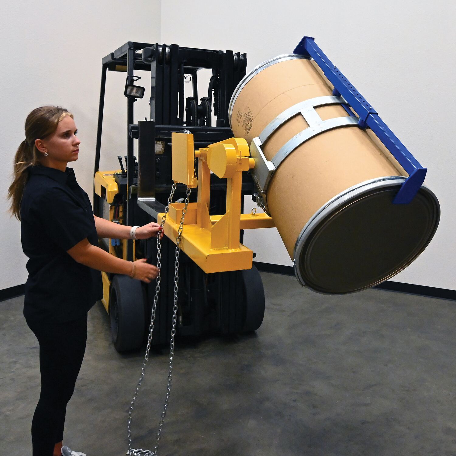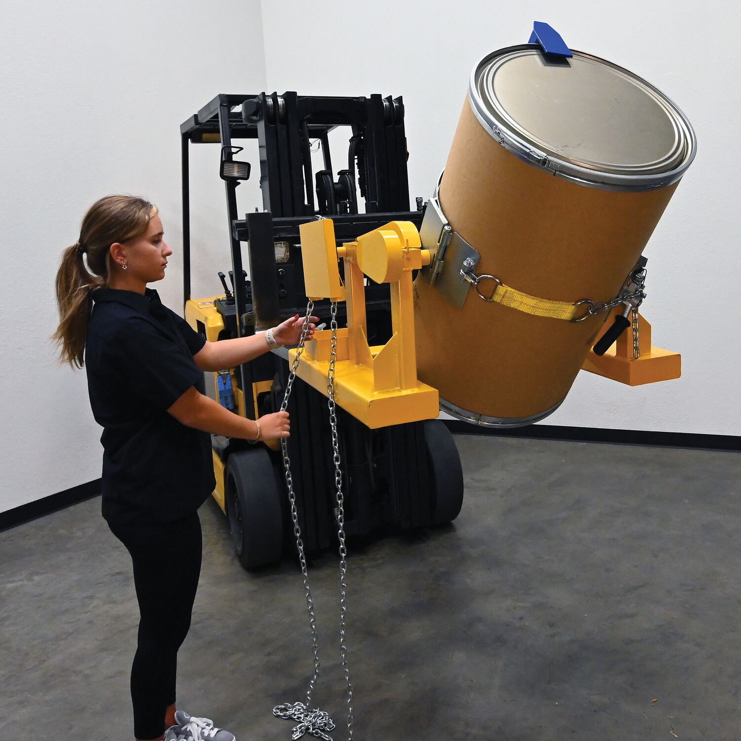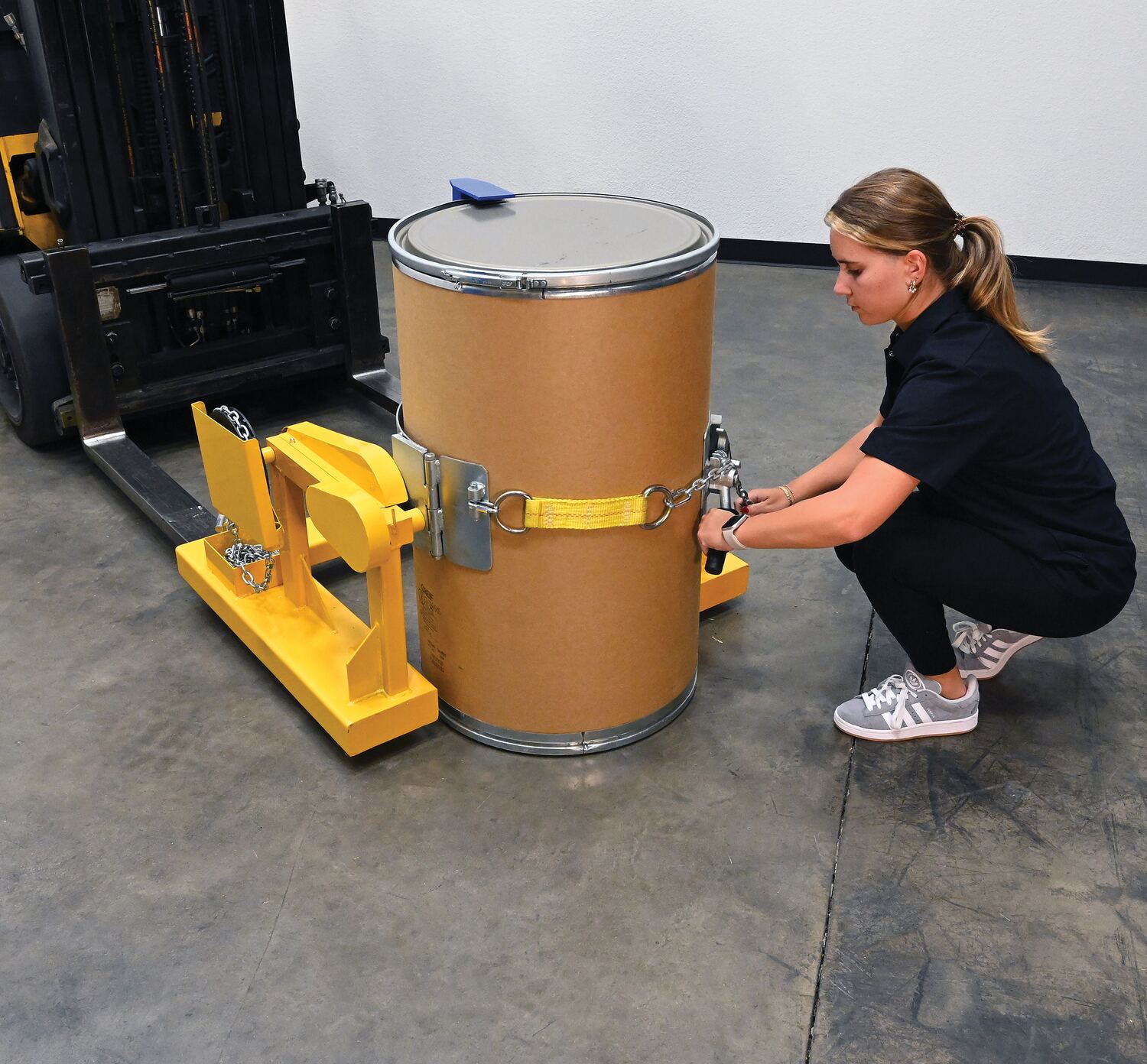 Steel Fiber & Plastic Drum Adapter Carrier/Rotator For 30 Gallon and 55 Gallon Drums BlueThis fiber drum adapter is designed to hold and support fiber and plastic drums. Comes complete with both an adjusting arm and a high strength nylon strap so thirty (30) gallon and fifty-five (55) gallon drums can be used with listed stackers and carrier/rotators.