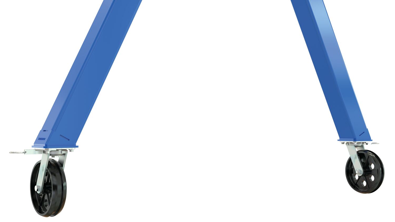 The fixed height knockdown industrial steel Gantry cranes are uniquely designed to be disassembled when not in use for compact storage and easier transportation / shipping from one job site to another. Facilitate easy mobility from one area to another with total locking casters. The total locking casters lock the rigging in any position and locks the wheel from rotating. Features quick setup design. Do not move units while loaded. Painted blue finish. Designed for semi-permanent or permanent applications. Requires assistance from fork truck to set-up.
