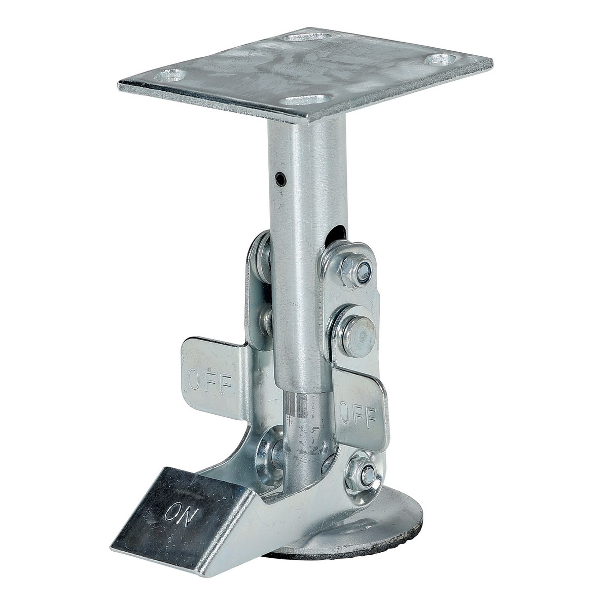 Galvanized Steel Top Mount Floor Lock 6-1/2 to 7-1/4 In. Height GrayFloor locks may be used on platform trucks, fixture dollies, or equipment with casters. Simple foot pressure immobilizes equipment. Locks when large friction face is pressed against the floor. To release simply kick release rod. Brake is independent of casters and can be installed to any convenient location on the cart. Vertical mounting plate designed to mount to sides of carts and other portable products. The spring loaded pad accommodates uneven floors. Units mount with pad 1." off the floor when retracted.