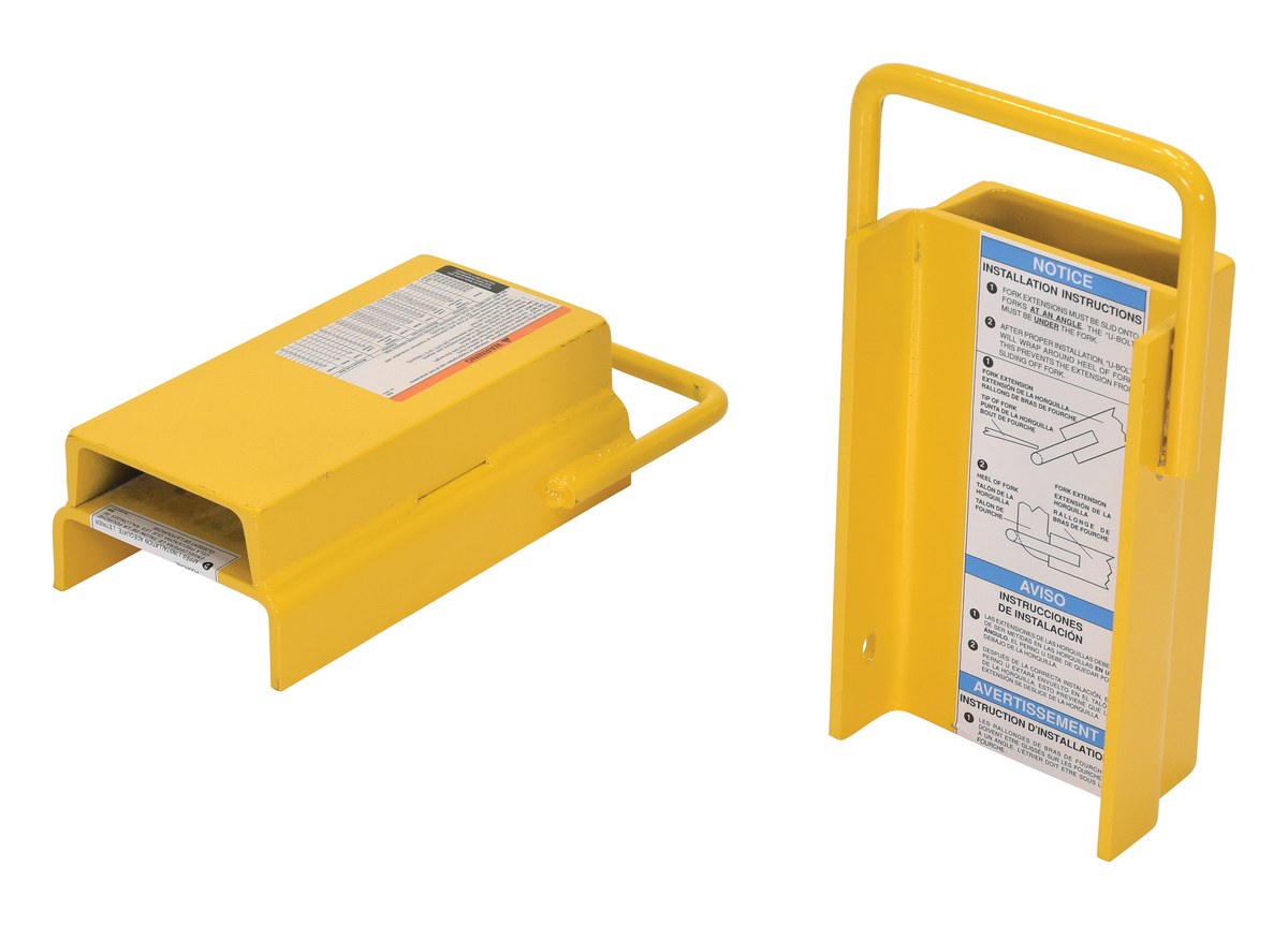 A rear spacer protects against possible damage to the fork truck, as well as products. Insert the loop at the tip of the fork and slide it up at a 45 degree angle. Then, lay it down over the existing forks. The attached end loop secures the spacer around each fork. Once in place, the spacers prevent pallets from retreating backwards onto the fork.