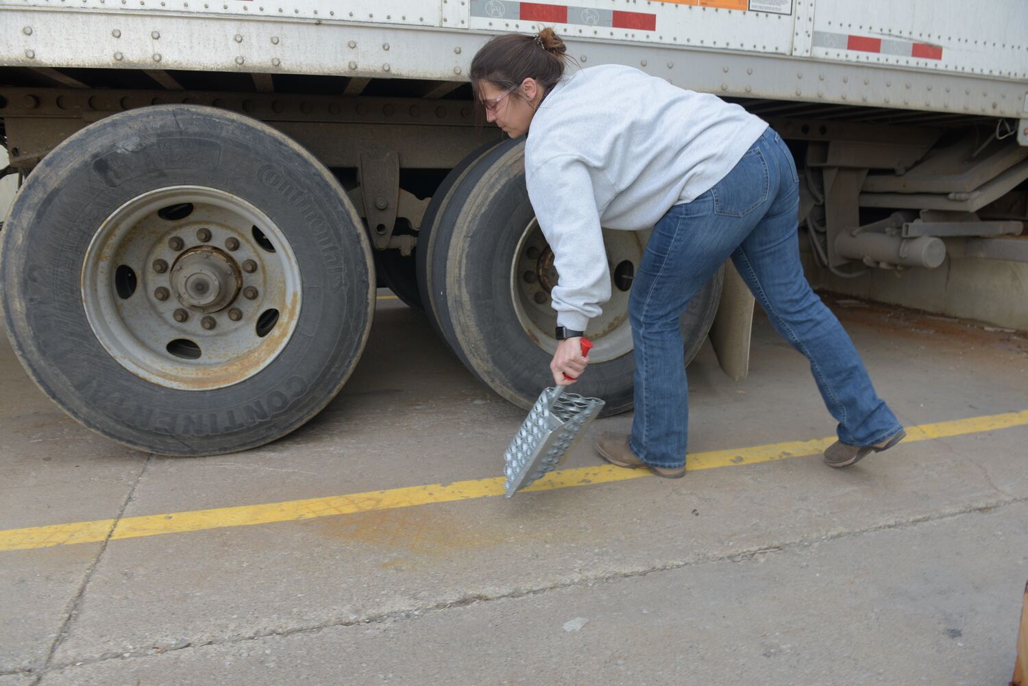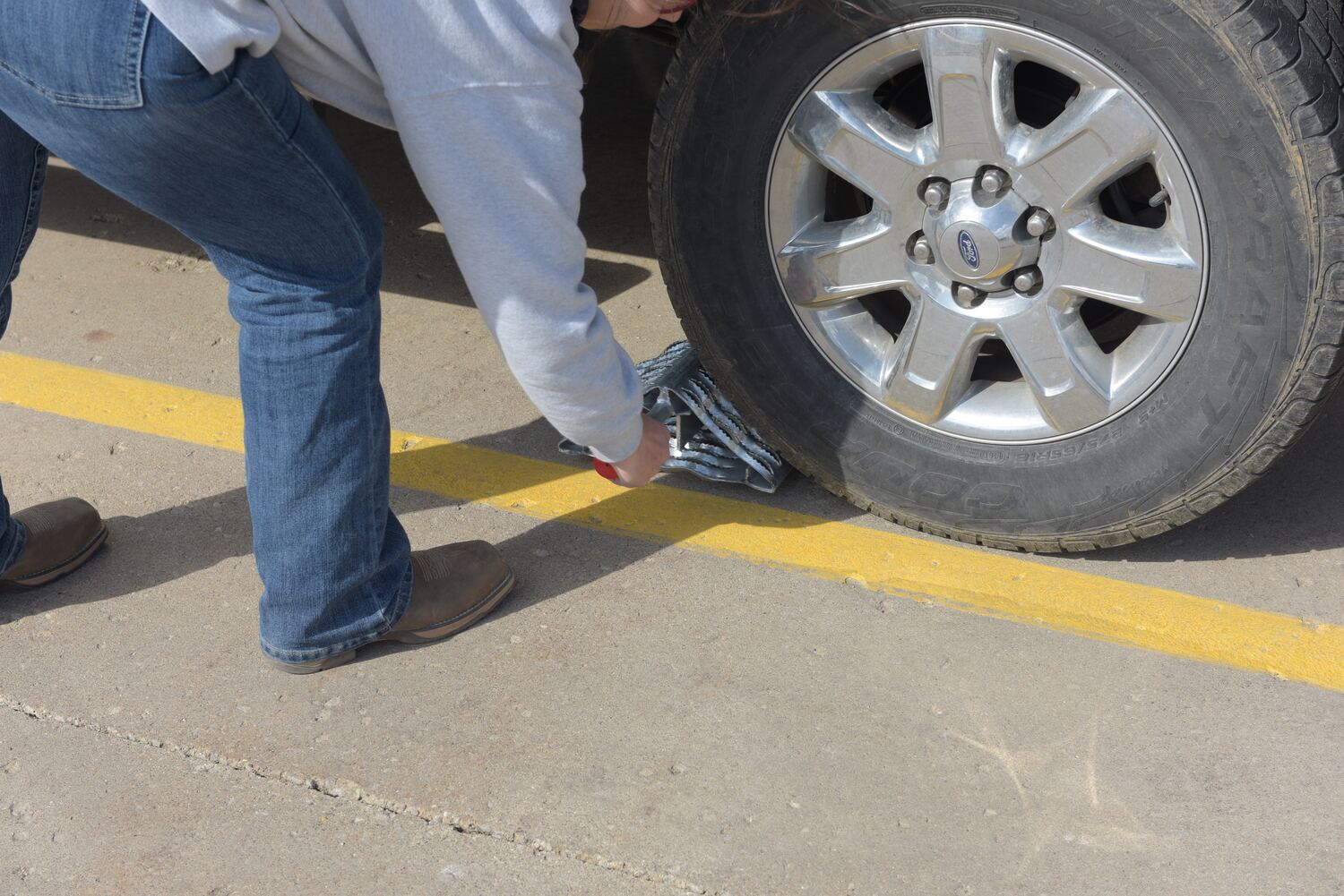 The steel Wheel Chock is made of serrated steel in a grate style. It has a galvanized finish and includes a positioning handle with grip.