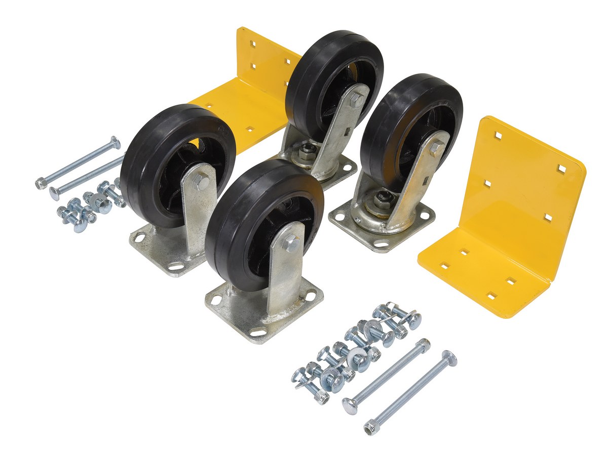 Casters for the self-dumping hoppers create a more worthwhile portable unit. Casters are constructed of glass filled nylon for strength and durability throughout a lifetime of use. The high capacity allows the simple transport of heavy loads promoting task efficiency. Casters are bolted-on by utilizing the factory stamped hole in the fork tubes.