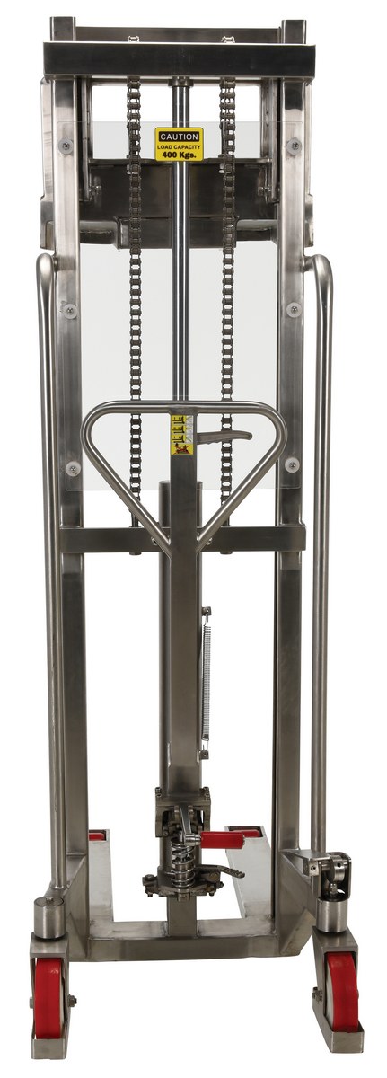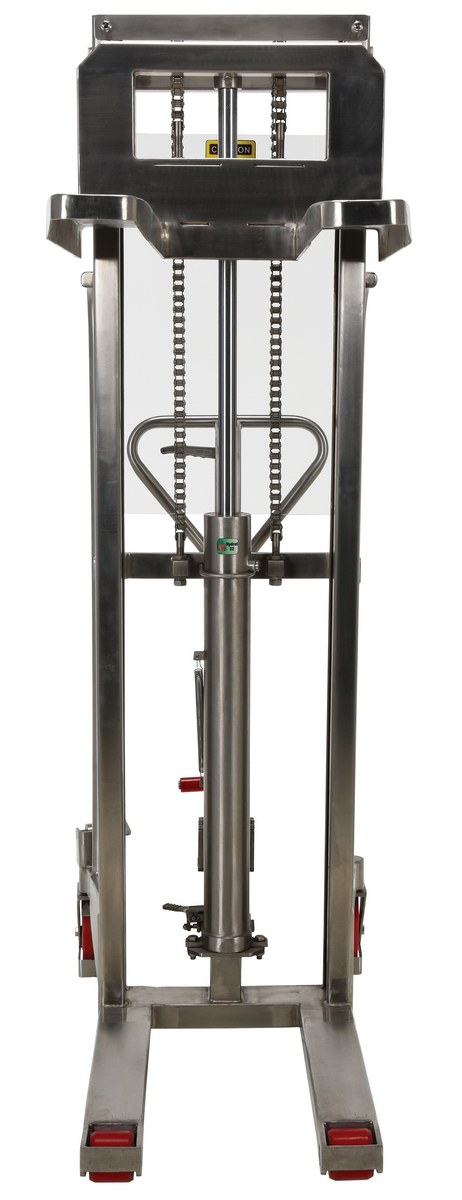 The Hefti-Lift is a user friendly, stainless steel portable hydraulic lift. The lift provides reliable, power lifting when moving and positioning loads. The non-slip chain is used for accurate positioning while the unit rolls easily on two rigid and two swivel poly-on-steel casters that includes a foot operated brake. The lift is all welded construction and not for use with pallets.