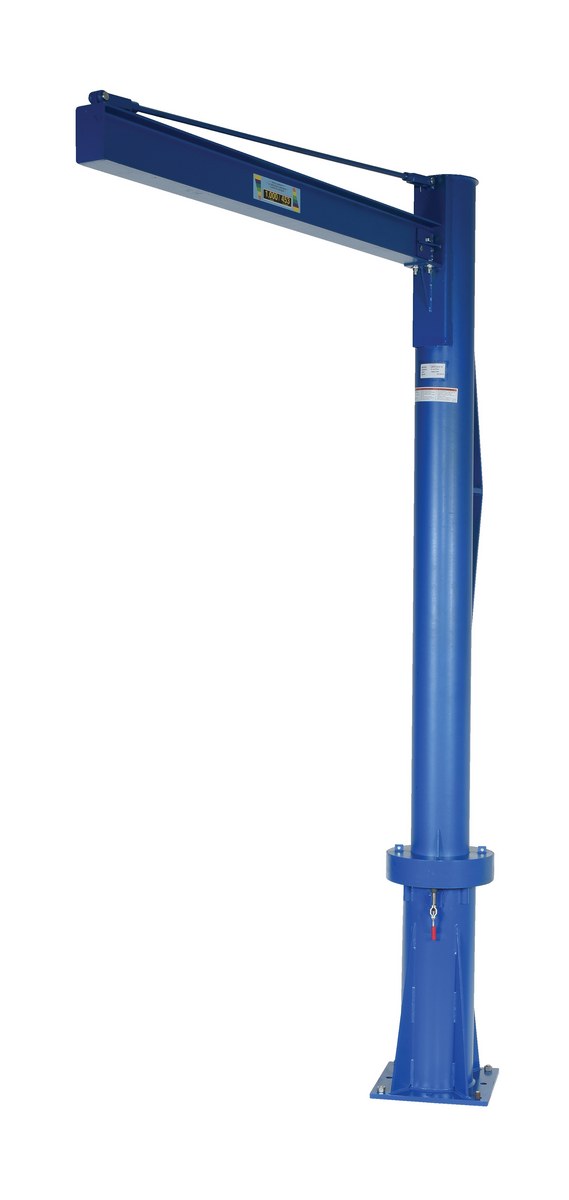 A multi-station transportable Jib crane is designed for use in multiple locations, includes jib crane and one base socket. Extra base sockets may be purchased for use in other locations. Friction brake design allows positive locking and controlled rotation of heavy loads. Standard six (6) inch high I-beam with three (4) inch flange width. Rugged welded steel construction. Requires reinforced concrete pad for installation. Hoist and trolley sold separately.