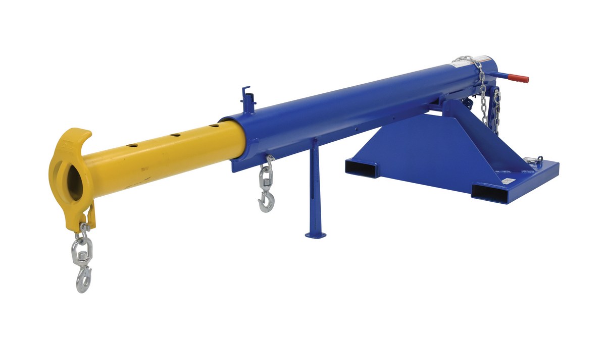 Steel Orbit Telescoping Lift Boom 30 In. Fork Pocket Center 4,000 Lb. Capacity BlueUnique performance, convenience, and safety features are built into every lift master boom. Fabricated from structural steel with welding to meet AWS creates a rugged and durable boom that will provide long term service. A safety restraint secures the boom to the fork truck for safe operation. Includes two (2) lifting hooks.
