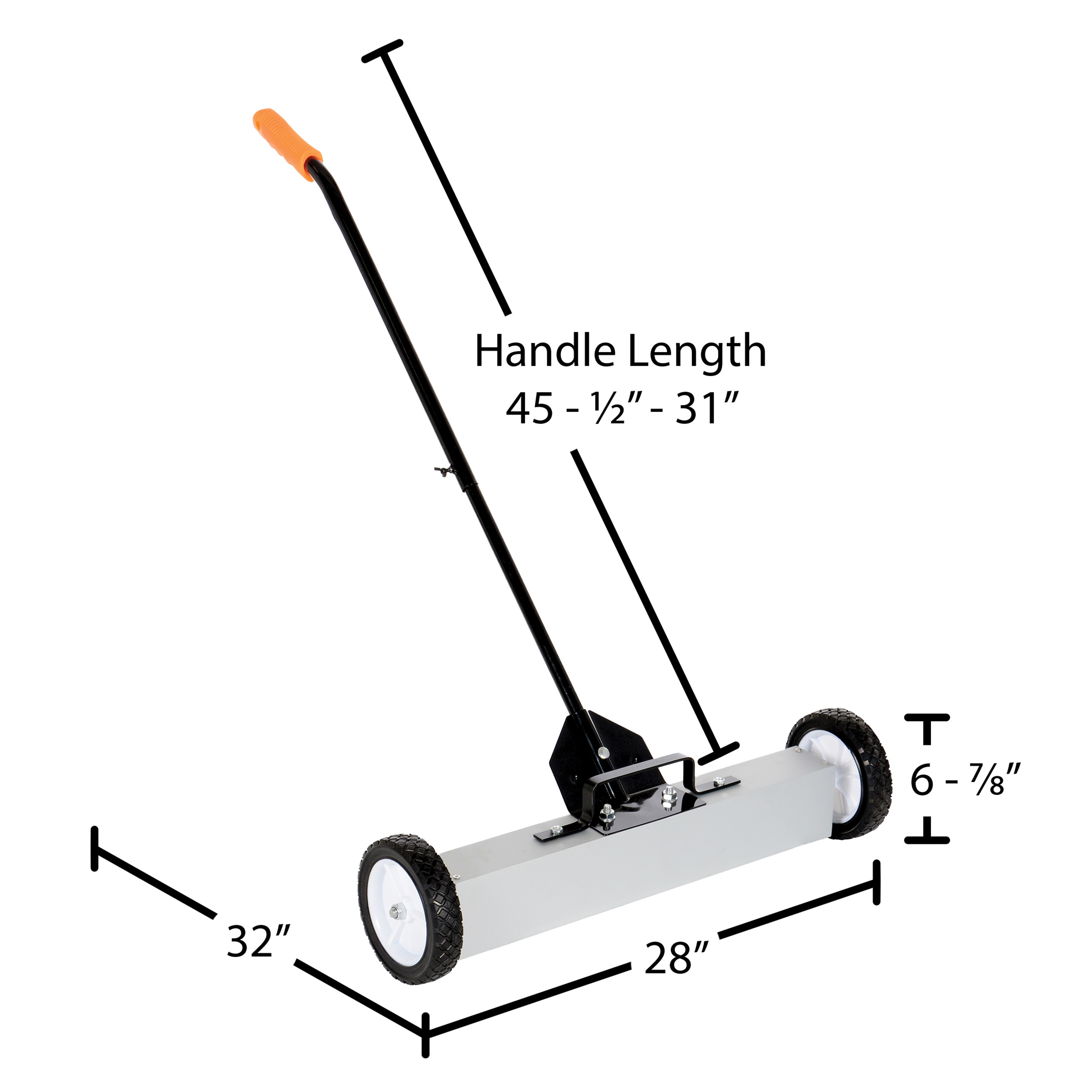Aluminum Magnetic Sweeper Handle Release 32 In. x 28 In. x 31 In. 30 Lb. Capacity SilverThe powerful magnetic sweeper is ideal for manufacturing facilities and construction sites. The sweeper is ergonomically friendly with a handle controlled release. The design and capacity can accommodate large and small materials. While, the standard handle allows for comfortable upright position during use, the wheels allow smooth rolling for quick and easy collection of objects.