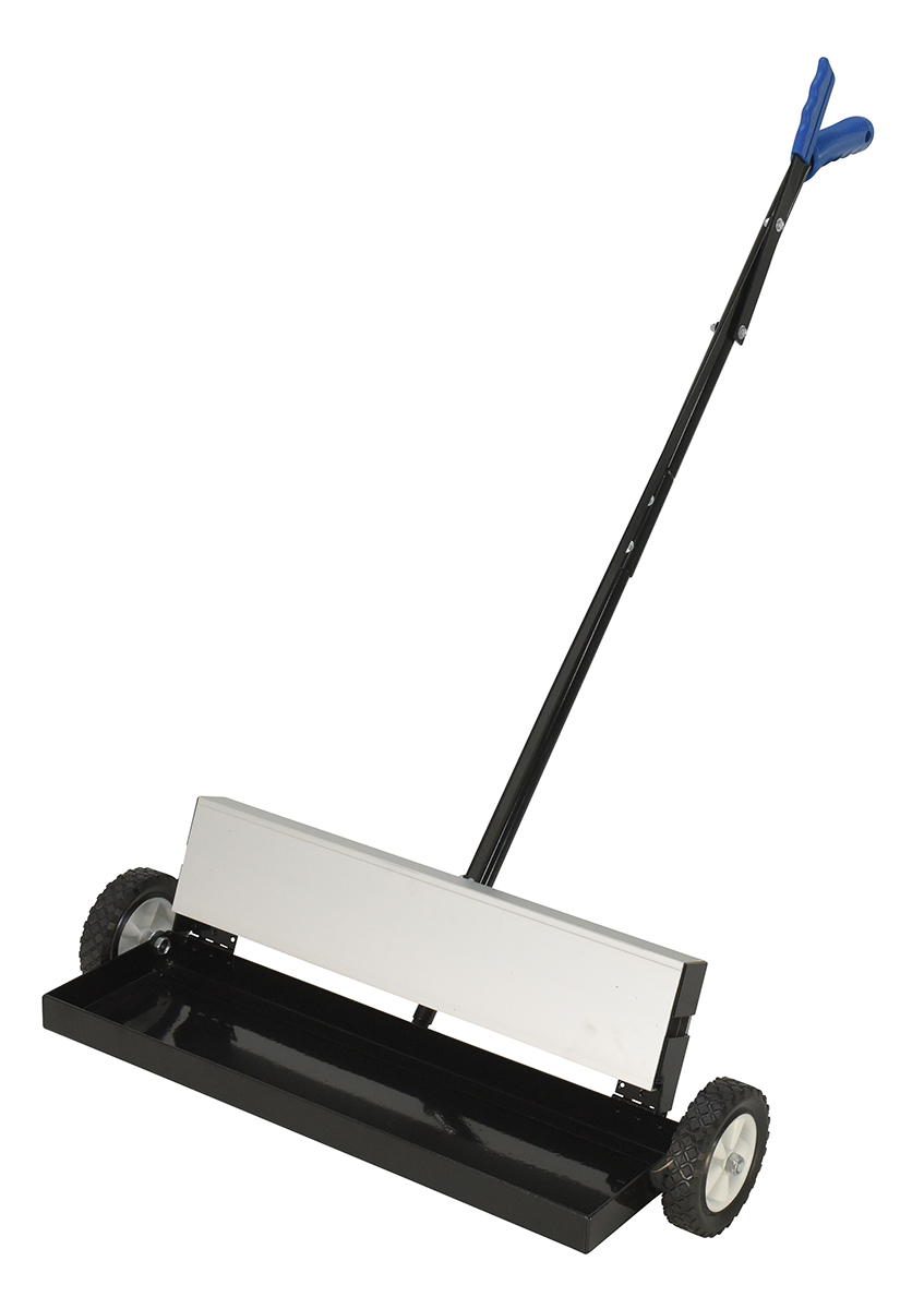 The powerful magnetic sweeper is ideal for manufacturing facilities and construction sites. The sweeper is ergonomically friendly with a handle controlled release. The design and capacity can accommodate large and small materials. While, the bended handle allows for a comfortable upright position during use, the wheels allow smooth rolling for quick and easy collection of objects.