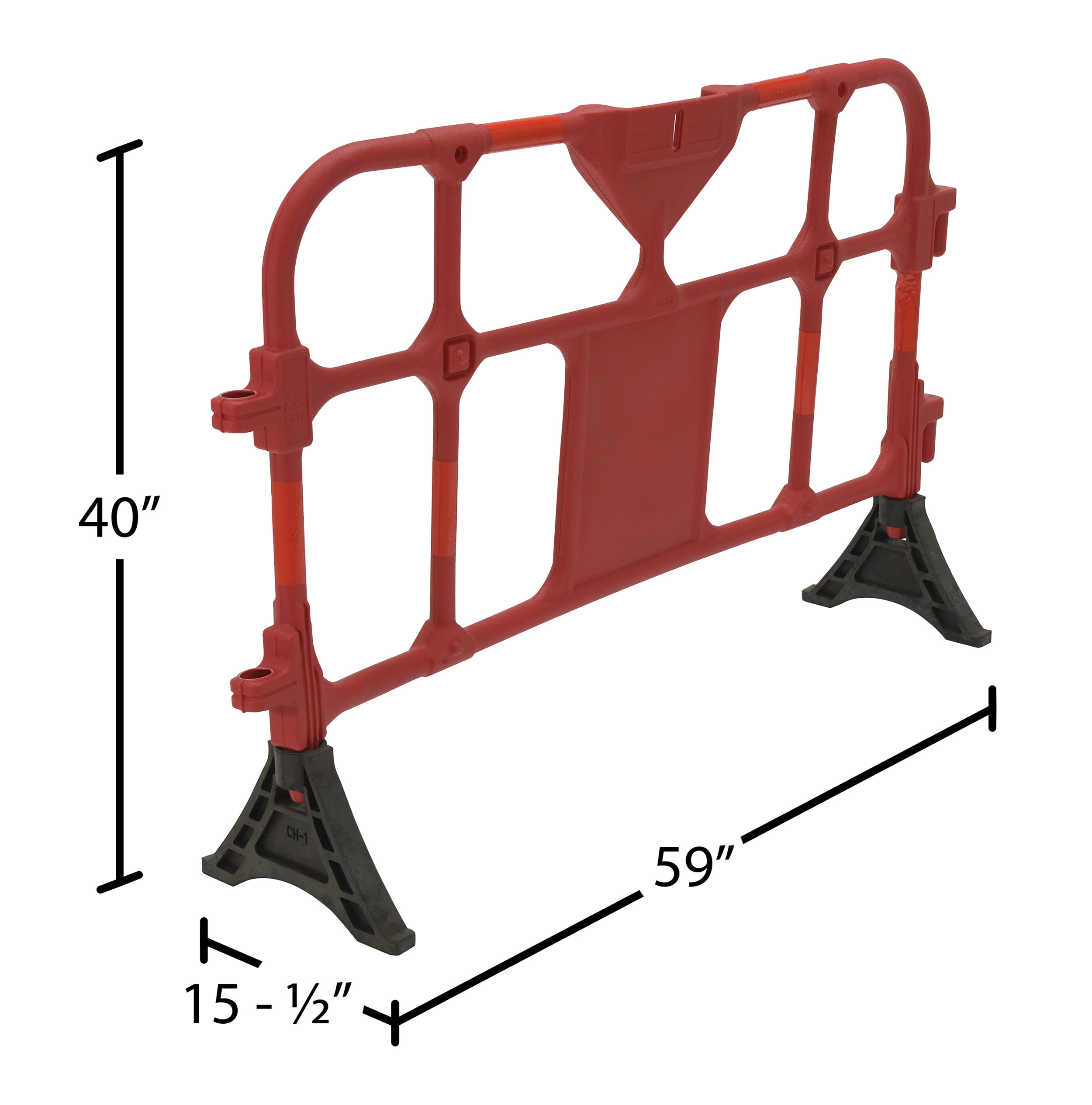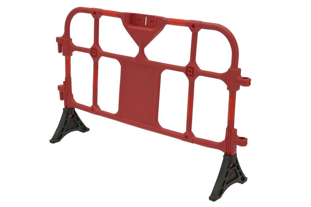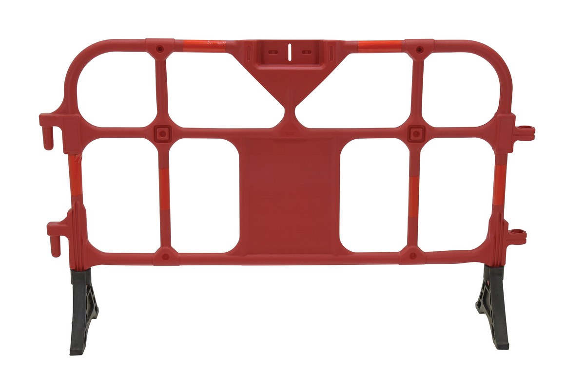 Plastic interlocking barriers will not rust and will retain attractive appearance. Reflective red tape provides better identification at night. Barrier ends include connectors for interlocking multiple units. The non-removable feet come pre-filled with sand for weight ballast. Feet can be rotated to allow for barriers to be stacked. Manufactured from hope material and includes UV stabilizer for longer life. Ships and stores assembled.