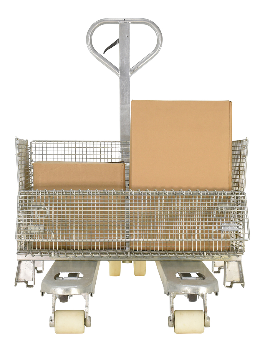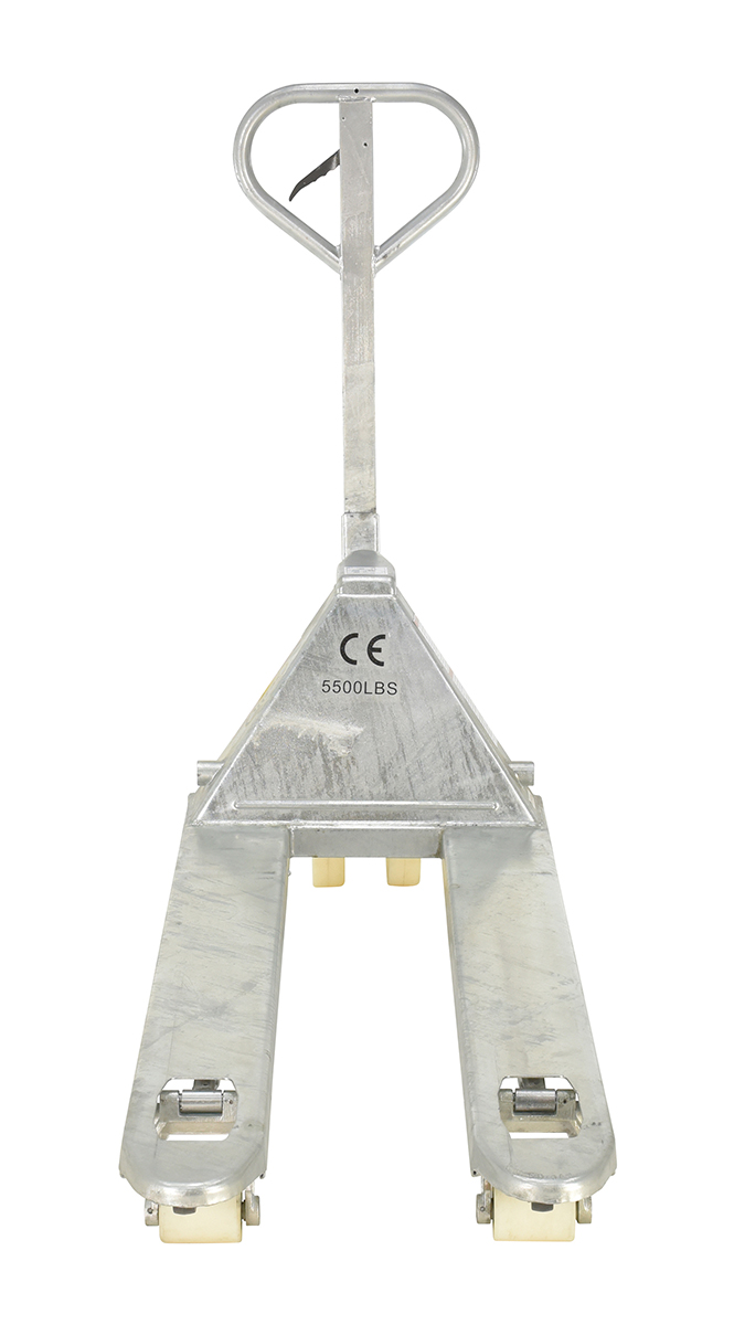 The specialized pallet trucks are ideal for corrosive environments. The pallet truck includes a galvanized finish for strong durability in the harshest of environments. Full-featured pallet trucks were designed for chemical, pharmaceutical, and wash-down applications. 5,500 pounds uniform capacity.