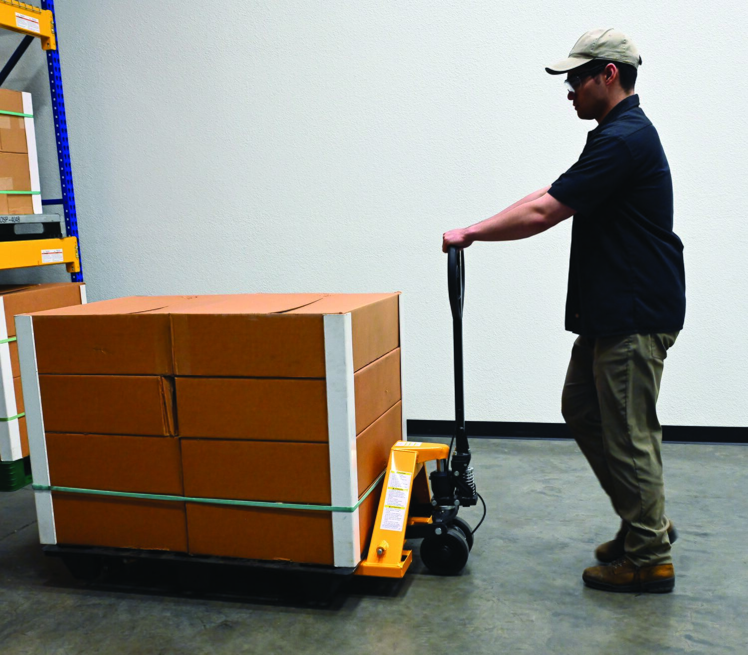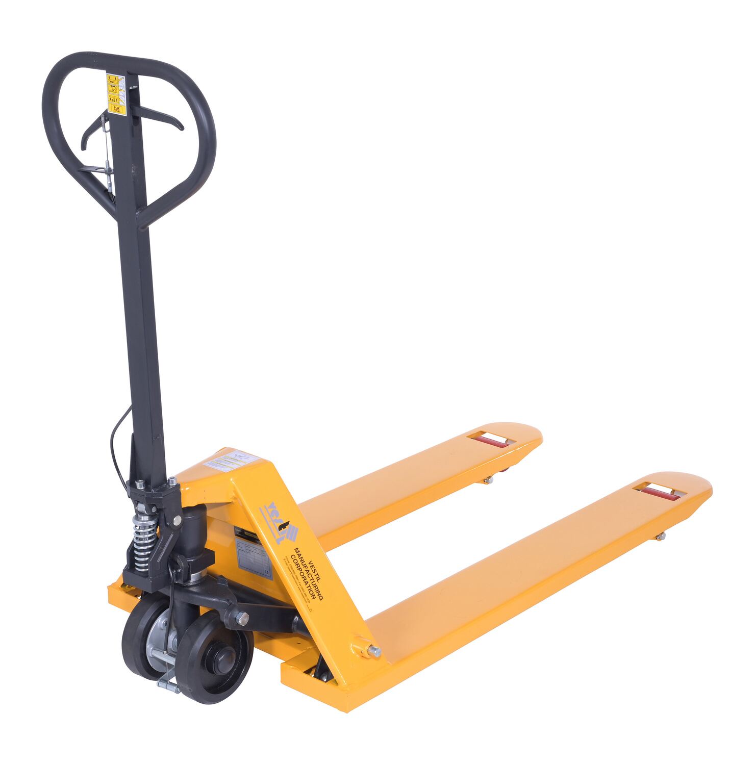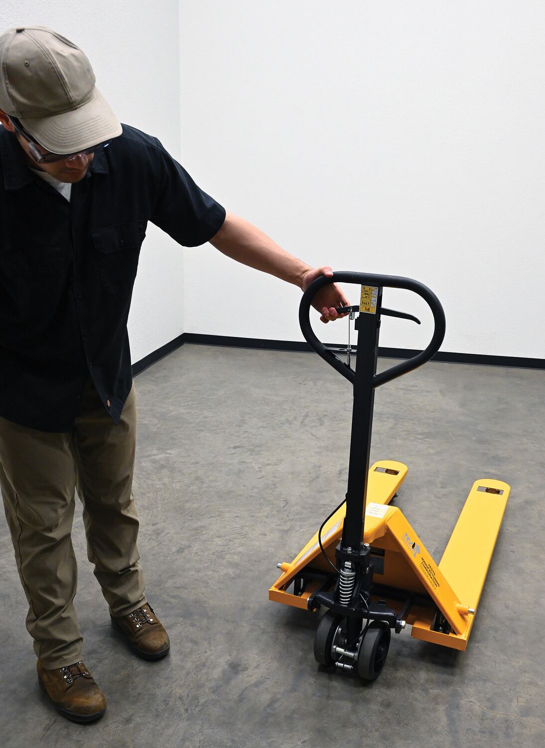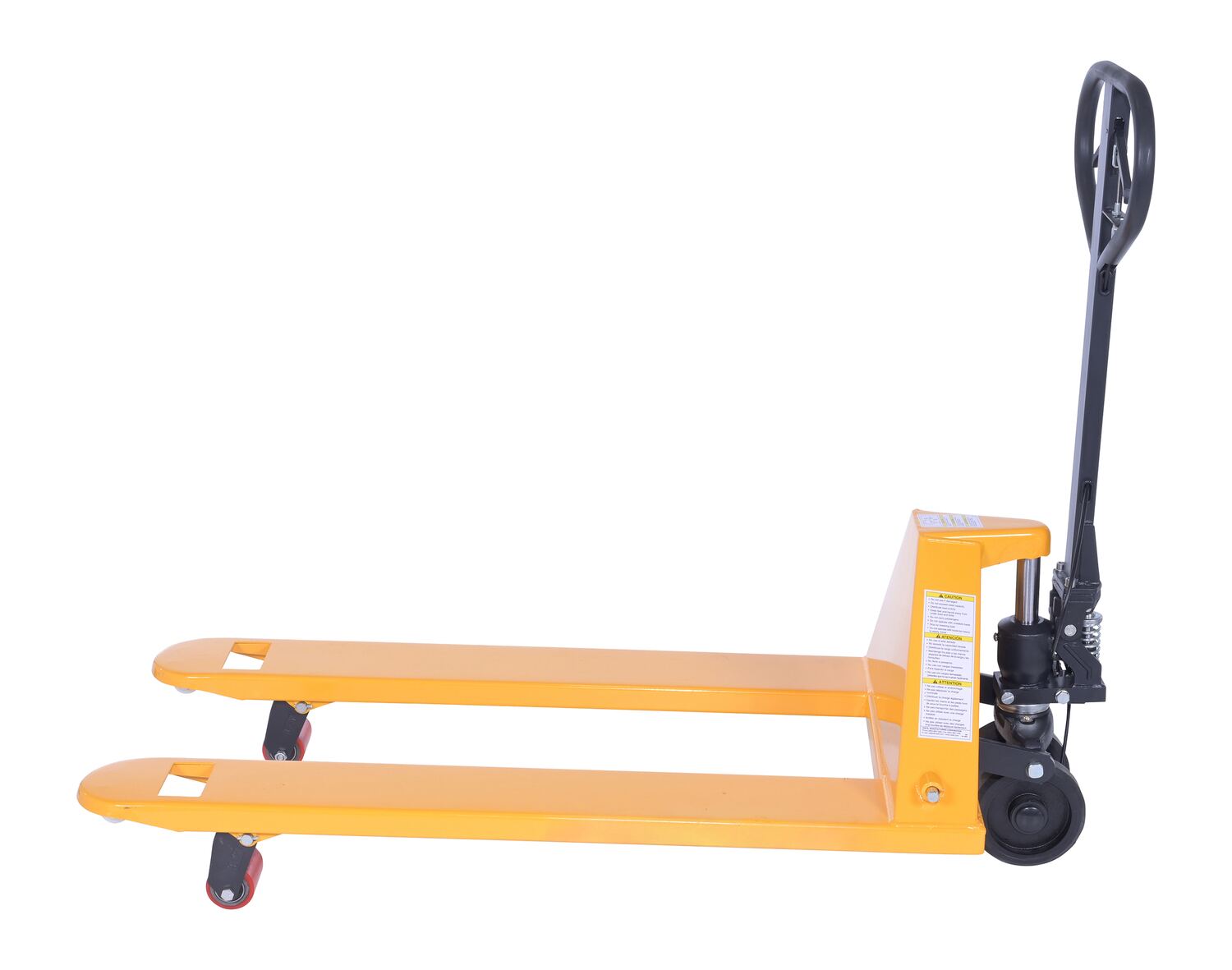 Steel Pallet Truck with Brake 66 In. x 27 In. x 49 In. 5500 Lb. Capacity YellowThe pallet truck with hand brake option allows you to depress the hand brake to slow down or stop truck.