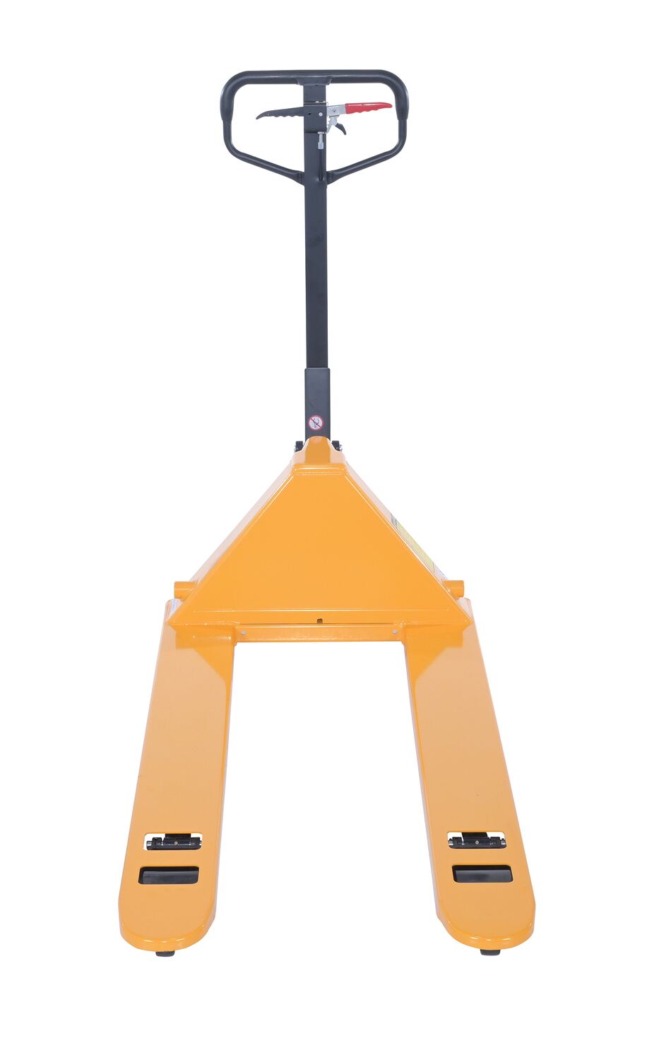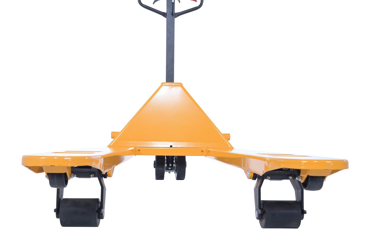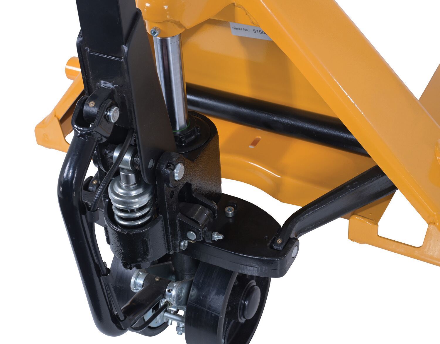 The Ergonomic power assist pallet truck is for anyone who has operated a fully loaded pallet truck and knows the most strenuous part is getting the wheels to start rolling. This pallet truck solves this back breaking problem. Pumping the handle of the pallet truck serves two purposes. First, it serves the traditional purpose of lifting the forks. Second, switch the power drive accumulator and by pulling the handle back, the pallet truck begins to roll automatically, thus reducing the pulling force.