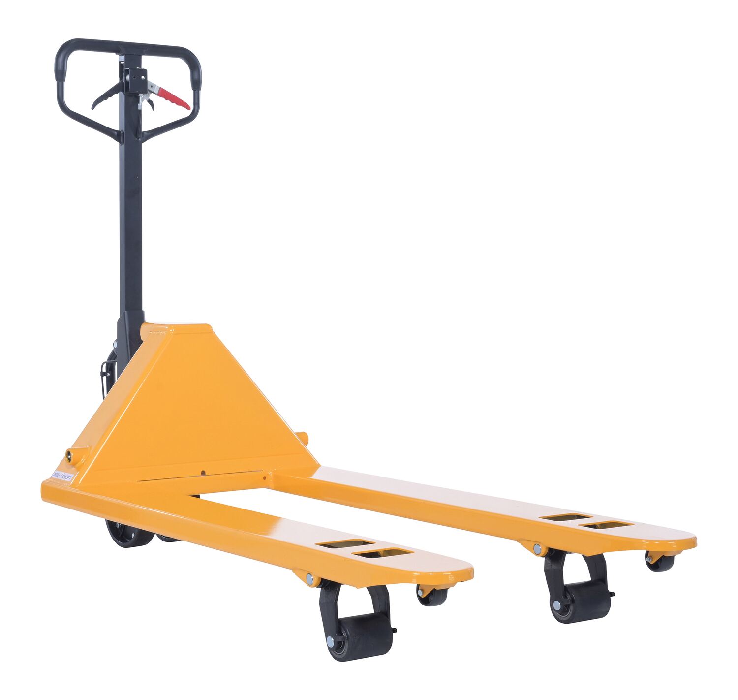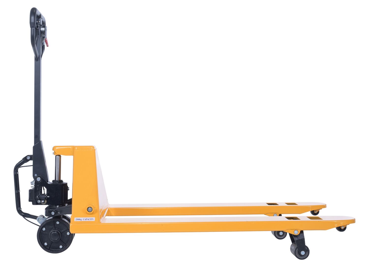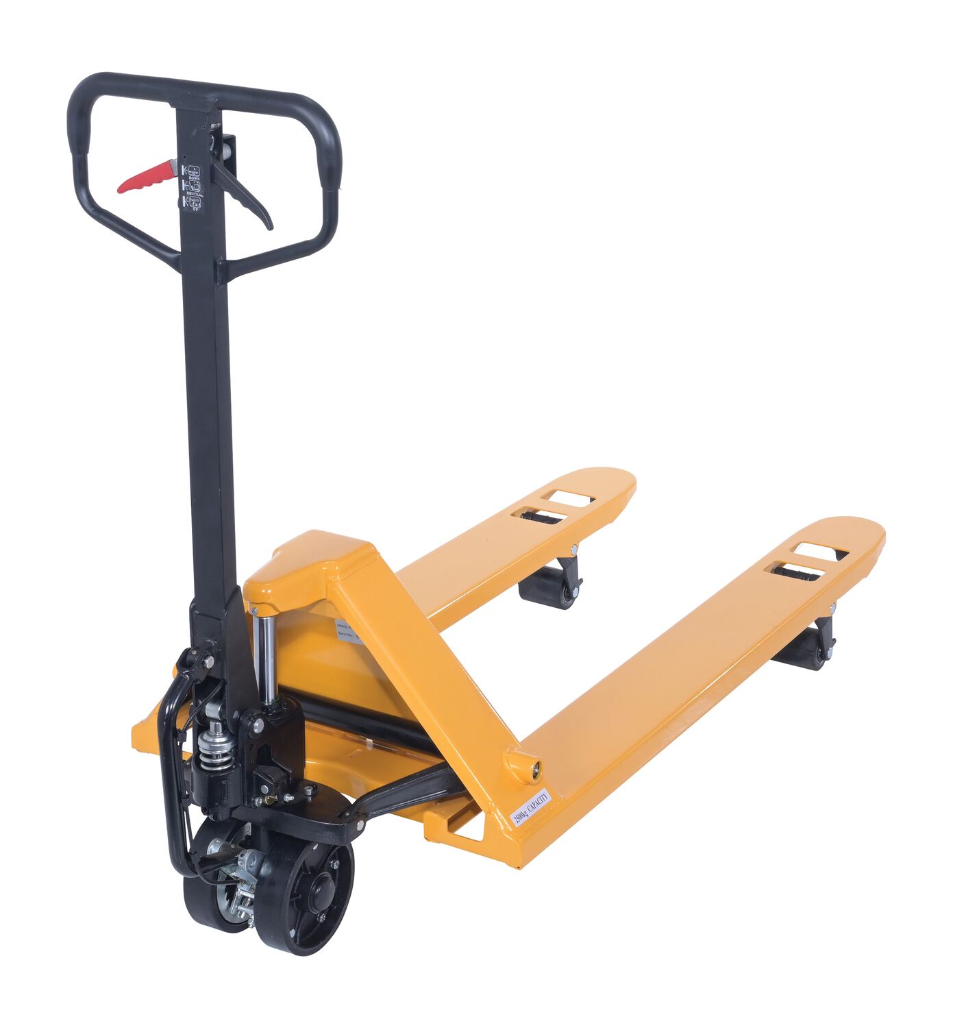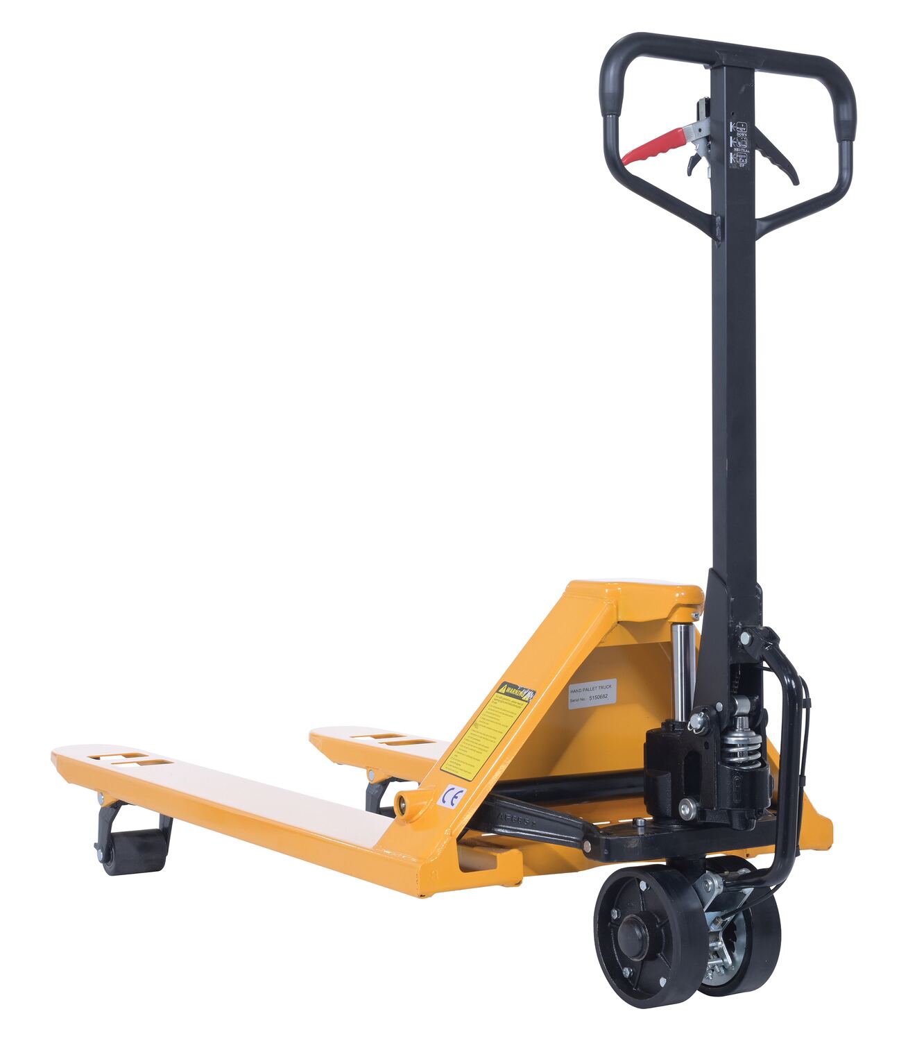 The Ergonomic power assist pallet truck is for anyone who has operated a fully loaded pallet truck and knows the most strenuous part is getting the wheels to start rolling. This pallet truck solves this back breaking problem. Pumping the handle of the pallet truck serves two purposes. First, it serves the traditional purpose of lifting the forks. Second, switch the power drive accumulator and by pulling the handle back, the pallet truck begins to roll automatically, thus reducing the pulling force.