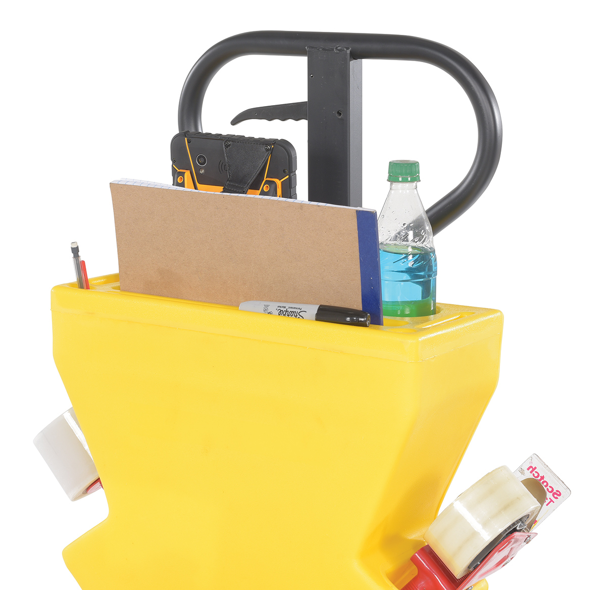 A pallet truck with a storage caddy is the perfect bundle of two innovative products. The pallet truck has an ergonomically friendly design with a limited pulling force required, while the caddy allows the user to be more organized and efficient. With a strong powder coated steel construction, the pallet truck moves easily between areas. Nose wheels are located on the front edge of each fork to assist in clean pallet entrance and exit. A molded plastic design allows the caddy to be durable throughout consistent daily use. Installation hardware and instructions included.