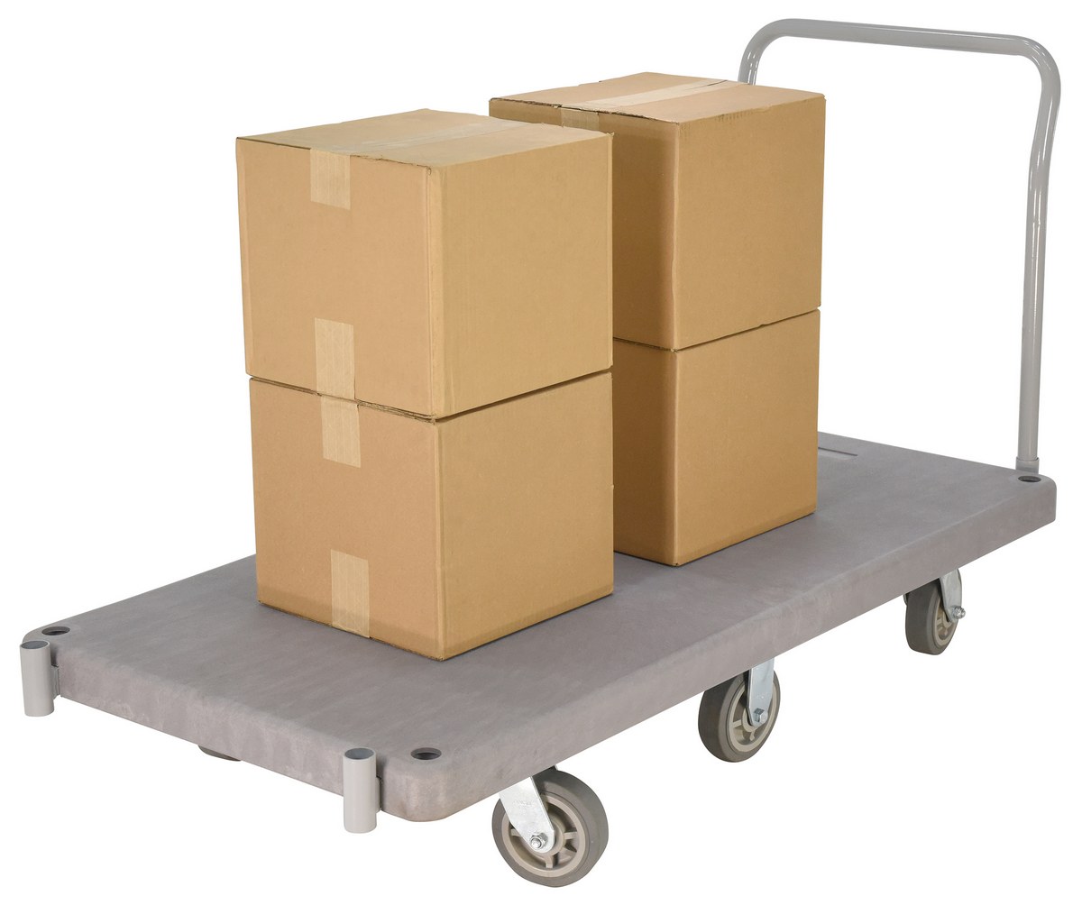 Plastic Heavy Duty Platform Truck 1 Handle 63-1/2 In. x 30 In. x 34 in. 3000 Lb. Capacity GrayThe heavy-duty plastic Platform Truck will not rust, discolor, or warp. Maintenance free and easy to clean. Honeycomb construction is reinforced for longer life. Extra square steel tube underneath platform to reinforce deck strength. This six (6) wheel unit rolls smoothly on polyurethane casters.