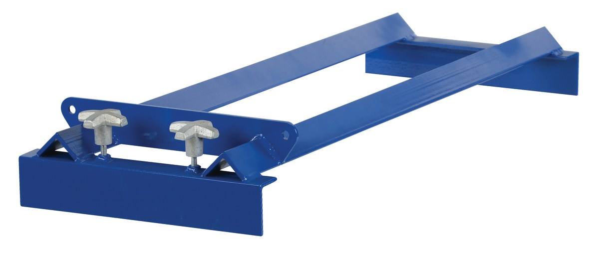 Steel Pallet Rack Drum Cradle 42-1/2 In. x 15-7/8 In. x 5-5/8 In. 800 Lb. Capacity BlueThe pallet rack drum cradle converts pallet racks into a versatile horizontal drum cradle. The unit works with either box beams and/or step beams. The drum angle is adjustable by using the height-adjustment bolts (sloping drum allows user to get 3% more fluid out).